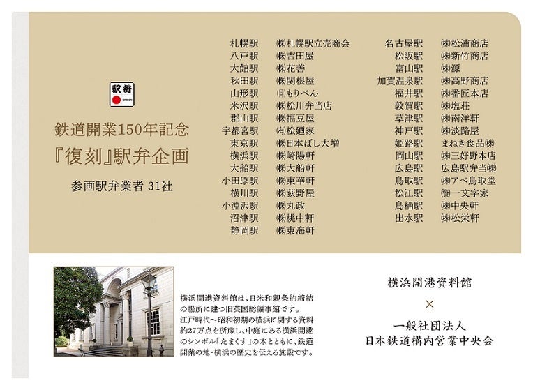 「復刻」をテーマに販売する駅弁は、鉄道初期の掛け紙や商品内容を再現し、歴史を感じられる商品です。鉄道とともに長い歴史を歩んできた駅弁各社の記念駅弁を旅のお供にしてはいかがでしょうか。この機会にぜひご賞味ください。