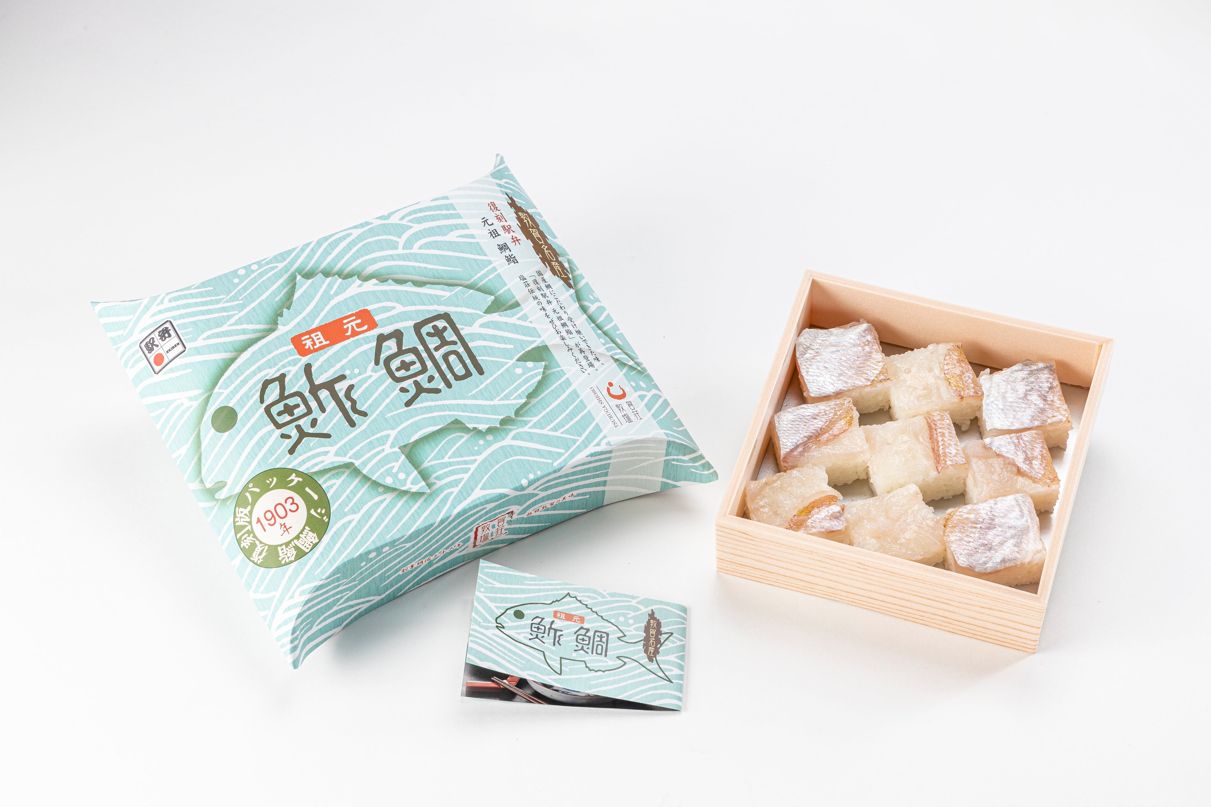 当時敦賀は若狭湾東の港として栄え、当社3代目の時代に「特徴ある地場名産品を生み出したい」との思いで、若狭湾や近海で獲れる「蓮子鯛」を使用した押し寿司を考案。