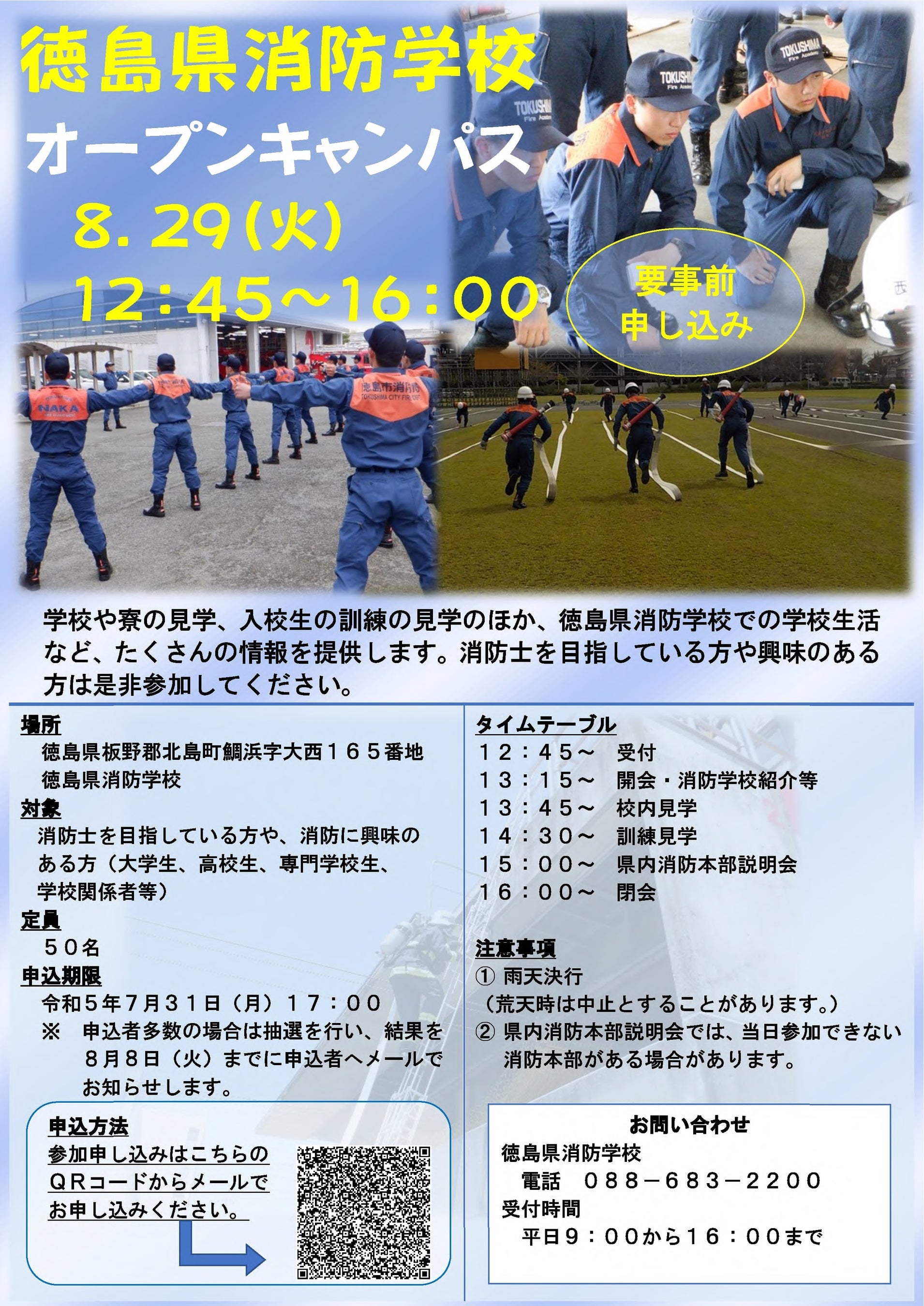 徳島県消防学校では、令和5年8月29日(火)に開校以来初となるオープンキャンパスを開催します。