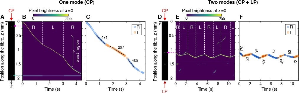 さらに、2つの光を逆方向から入射させる「対向伝搬モード」を導入することで、ナノ粒子を光の進行方向に押し流す光圧の内で、非キラル成分を完全に相殺でき、ナノ粒子の掌性のみに依存した光圧を選択的に作用させることに成功しました。この条件下ではRCPとLCPで粒子の輸送方向が逆転することが確認され、偏光を周期的に切り替えることでナノ粒子をファイバー上の約0.25 mmの範囲内で前方または後方に輸送可能なことを実証しました。
