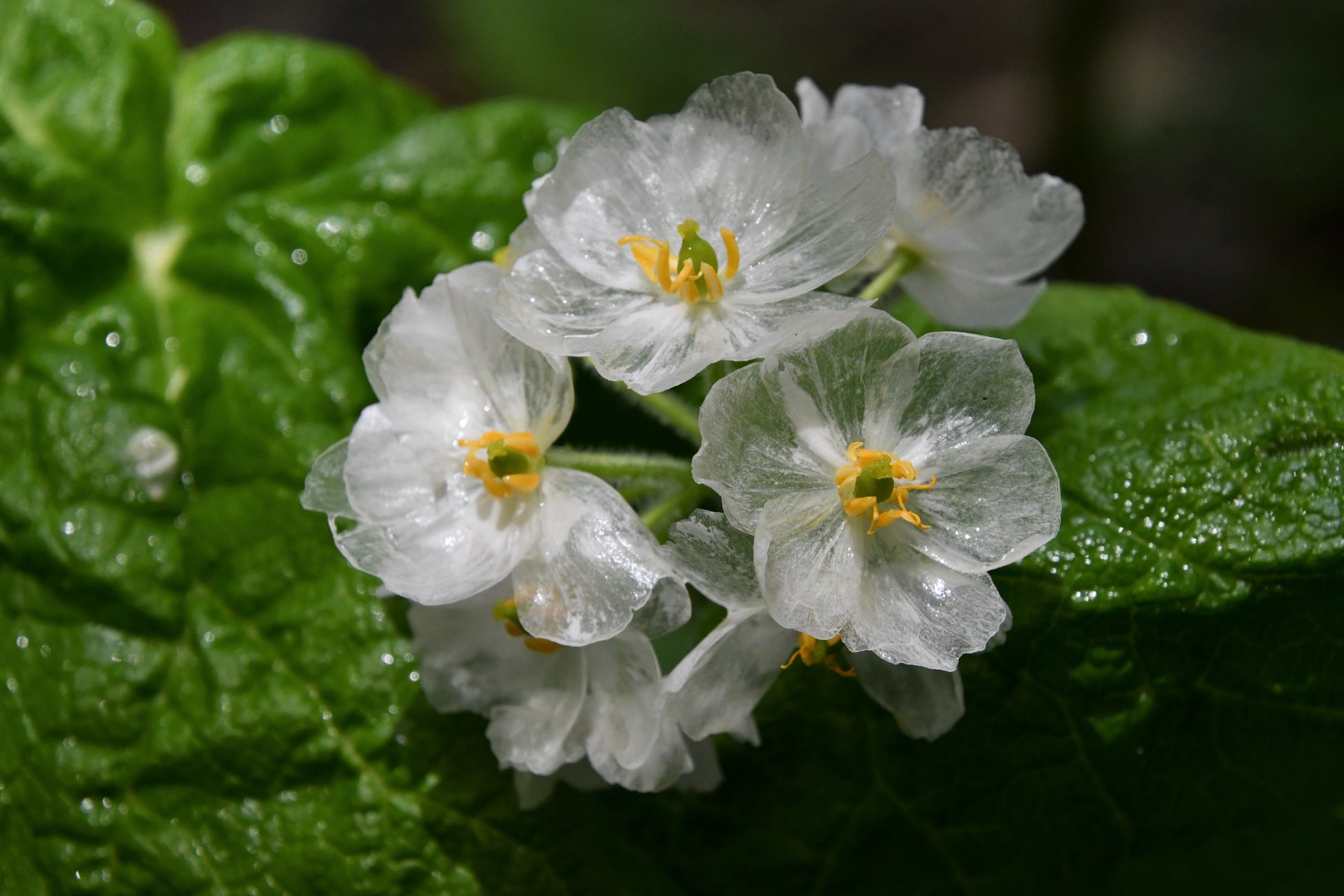 サンカヨウはメギ科の多年草で、冷涼かつ多湿な高地にのみ自生する希少な山野草です。普段は白い花びらですが、雨や朝露に濡れると、まるでガラス細工のように透明に変化します。