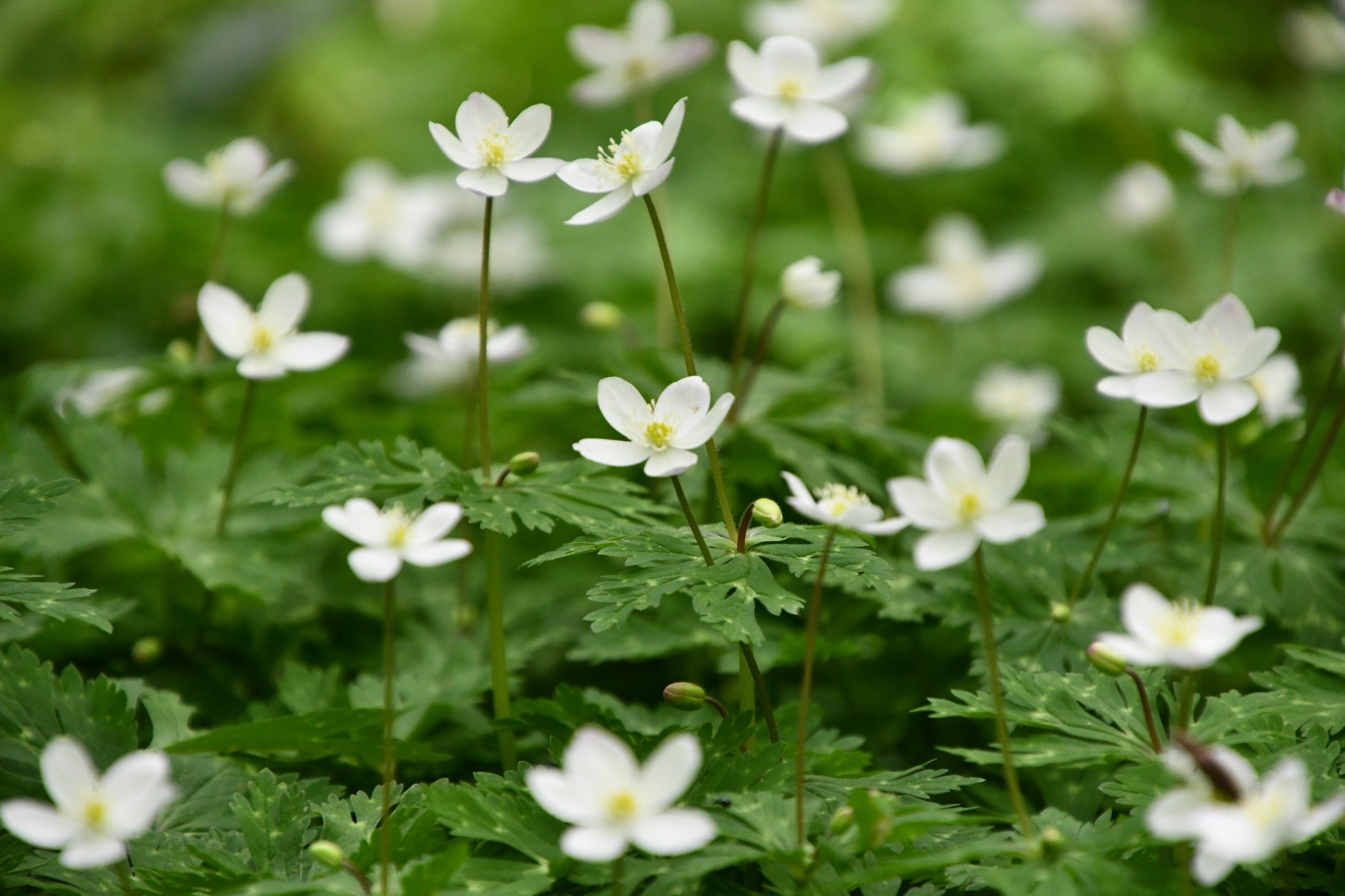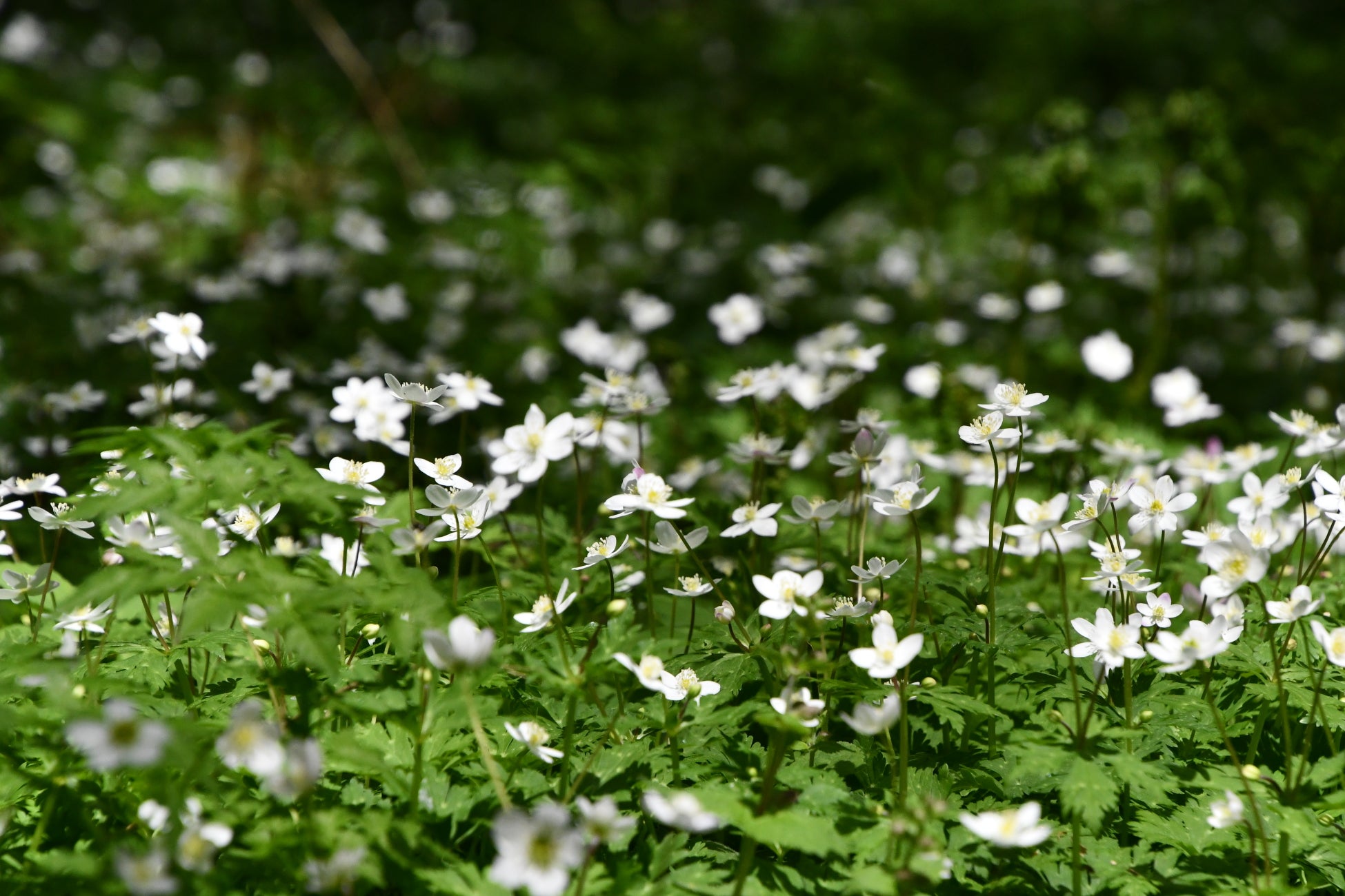 ニリンソウはキンポウゲ科の多年草で、一つの茎から二輪の花を咲かせることが名前の由来です。直径約2cmの小さな白い花が群生し、広範囲にわたって森の中を白く染め上げています。