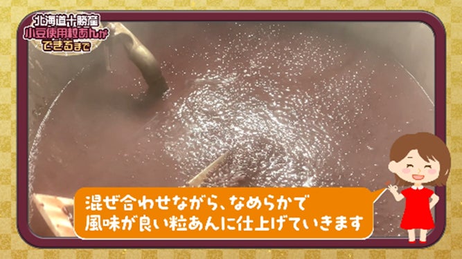 北海道十勝産小豆のおいしさについて、寒暖差で糖分が多い点などを説明し、選別から仕上げの「本炊き」まで手間暇かけて粒あんを作る工程を解説しています。