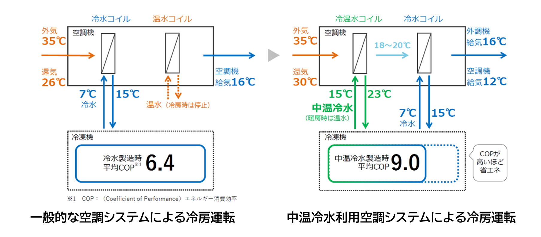 ・DHCから供給する14℃の中温冷水は、6℃に比べて、インバータターボ冷凍機による超高効率運転が可能