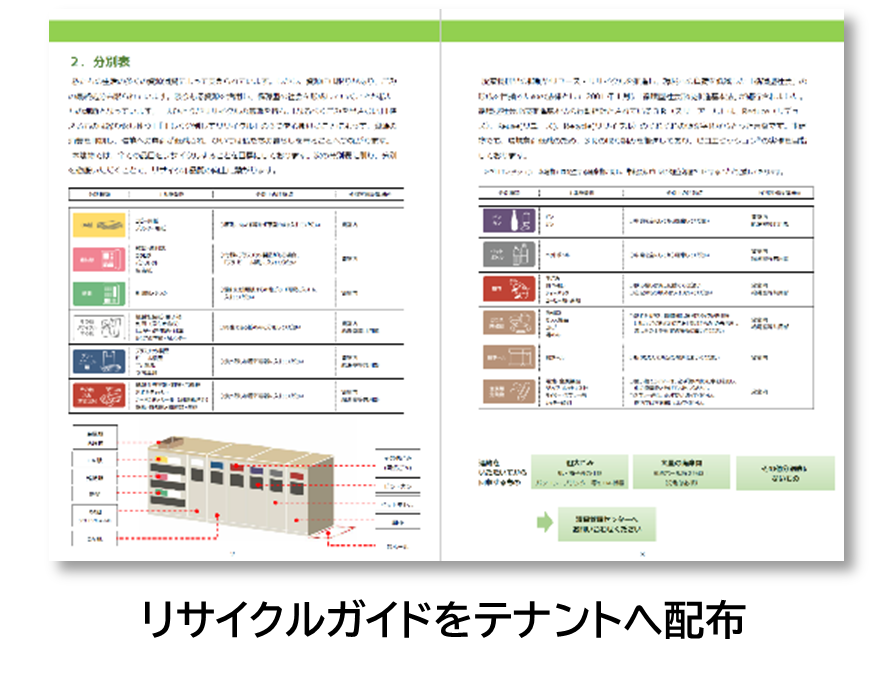 当ビルでは廃棄物のリサイクル率向上に向けた各種取り組みを実施しています。廃棄物処理方法として、雑紙リサイクル方式の採用、食品リサイクルの実施、一般廃棄物のサーマルリサイクル等に取り組んでいます。また、運用面では、廃棄物分別の周知・徹底の為、常駐スタッフを配置し、リサイクルガイドの作成・配布、テナント別に廃棄物の計量、分別状況チェック・ 分別改善指導等を実施しています。これらの取り組みやテナントの日々の分別協力により、廃棄物のリサイクル率は約98%となり、高いリサイクル率を実現しました。