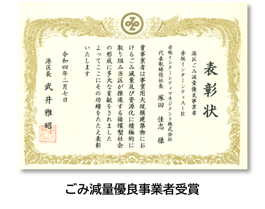 当ビルでは、事業系廃棄物の減量とリサイクルの一層の推進を図るため模範的な取り組みにより、高いリサイクル率を達成するなどの顕著な実績を上げている事業者等を表彰する制度において、その取り組みが高く評価され、「港区ごみ減量優良事業者」として表彰されました。