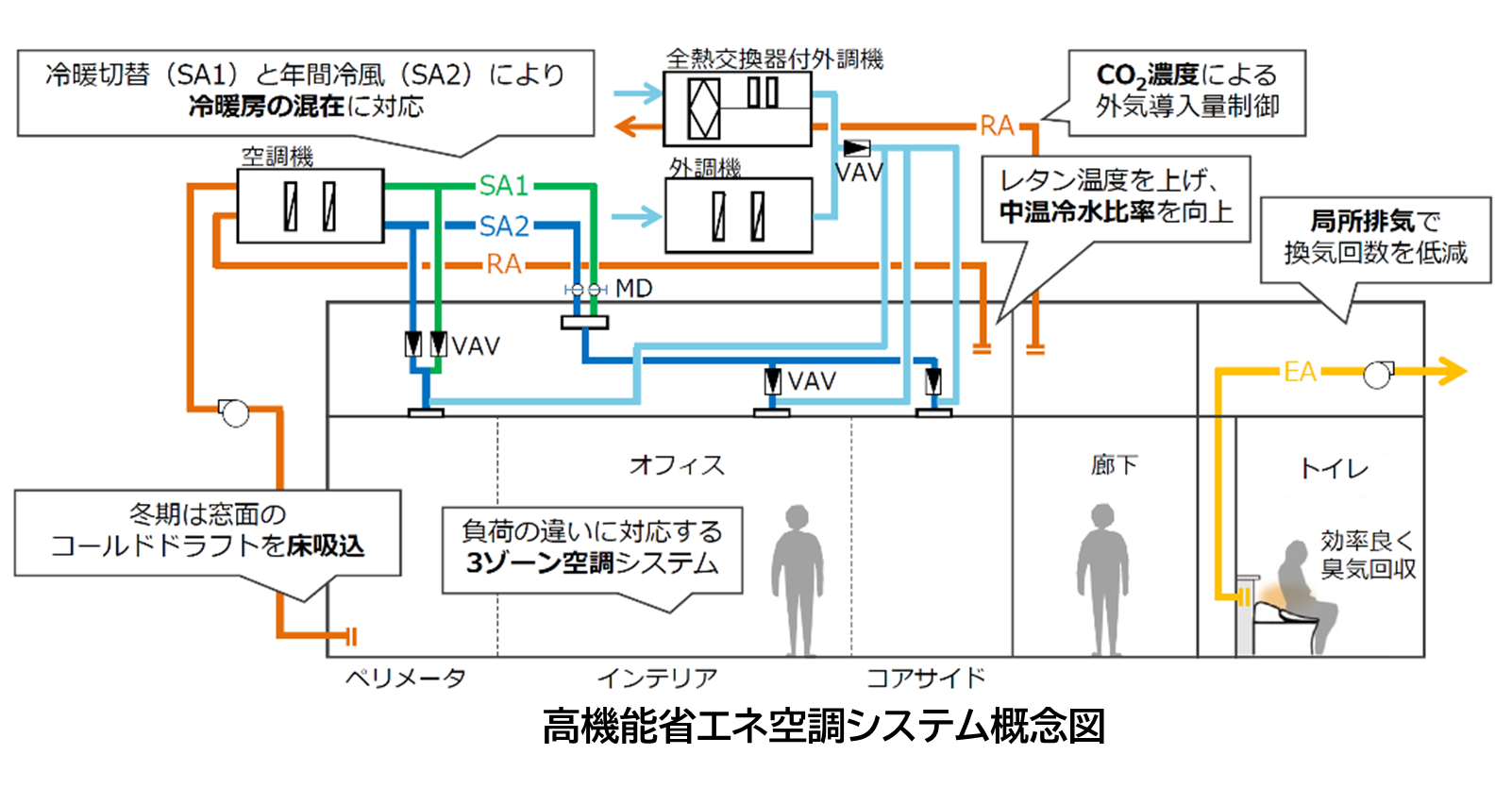 ・ペリメータ、インテリア、コアサイドの3ゾーン空調システムにより、ゾーン毎に異なる負荷に対応