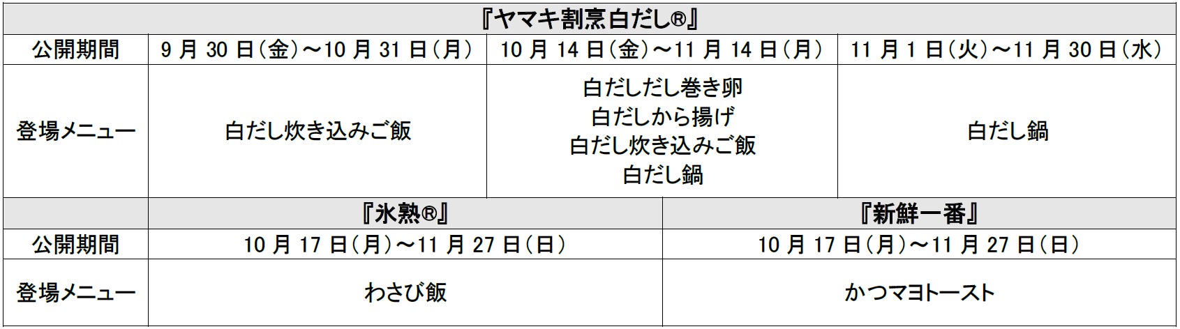 今回新TVCMが放映される『ヤマキ割烹白だし®』に加え、かつお節商品『氷熟®』『新鮮一番』のWEBCMを、YouTube広告とヤマキ公式サイトで公開いたします。いずれもヤマキアンバサダーの山崎育三郎さんが出演し、商品の魅力をたっぷり伝える表現豊かなCMに仕上がっています。