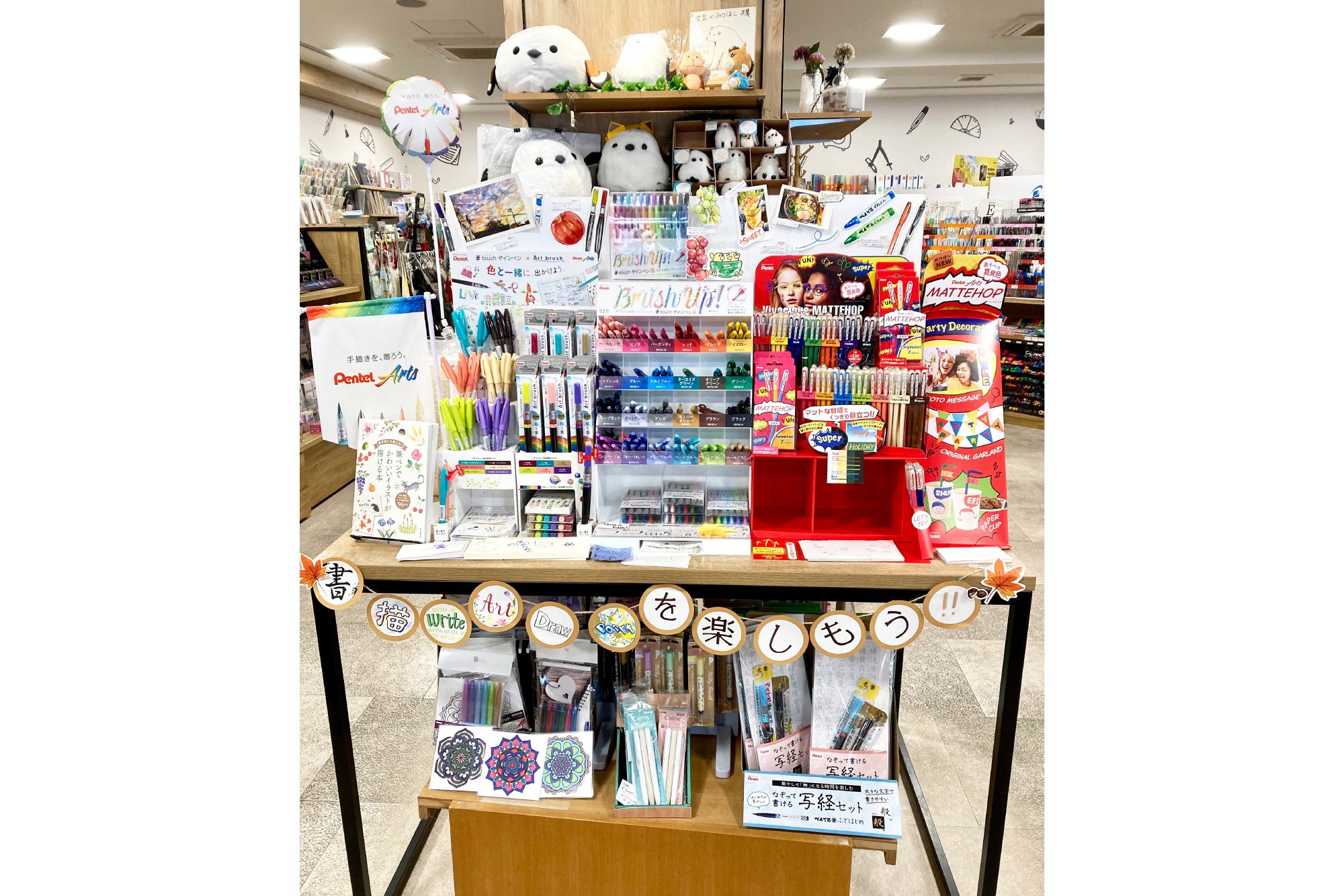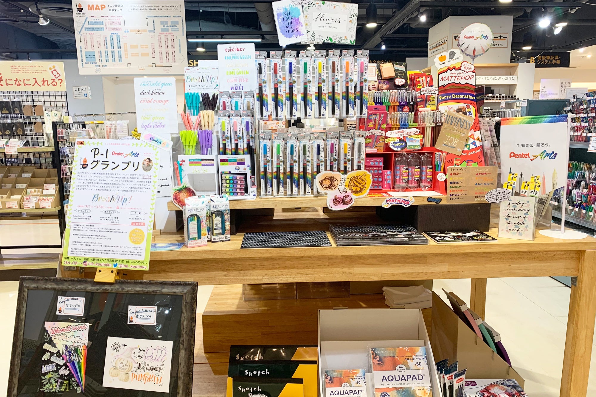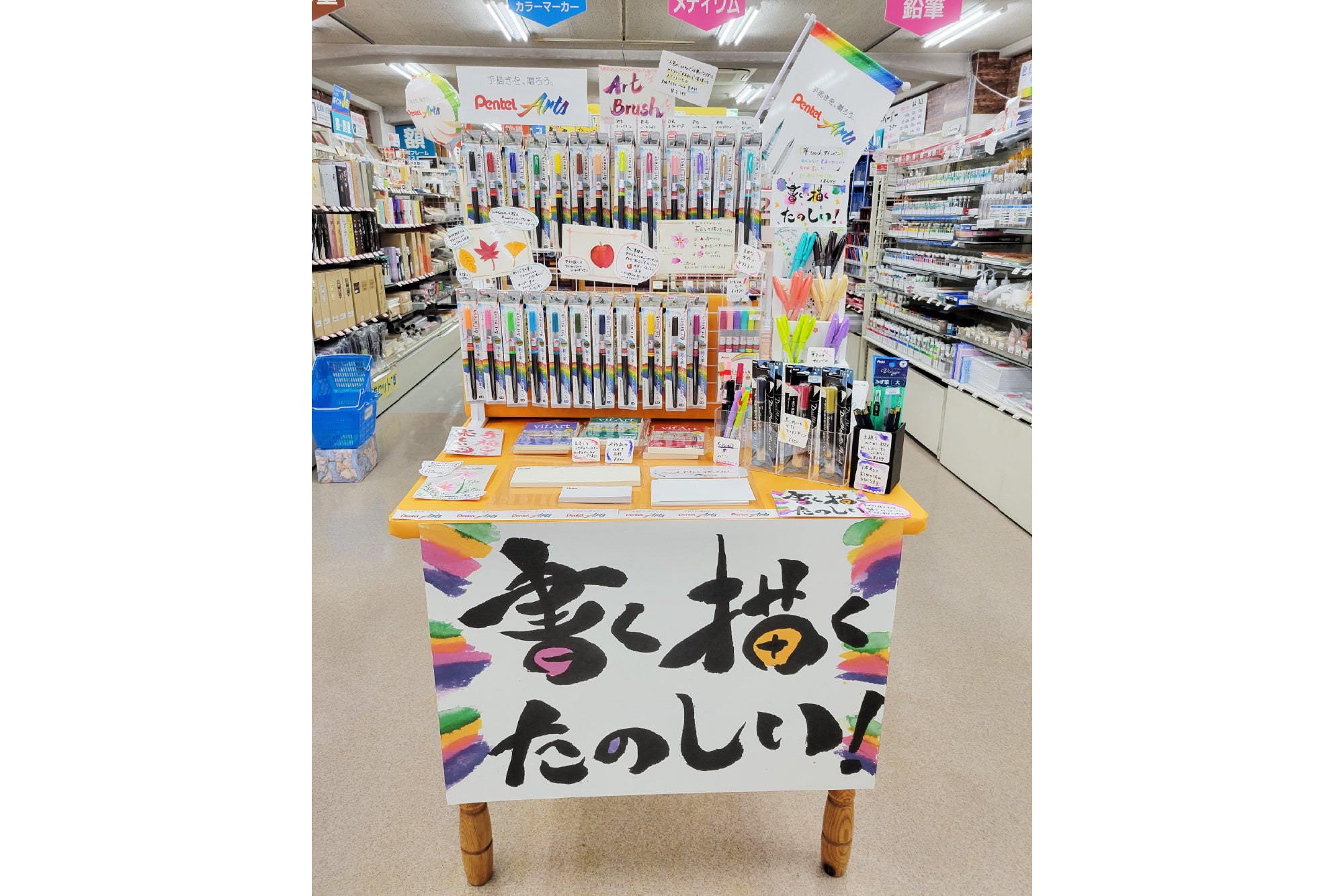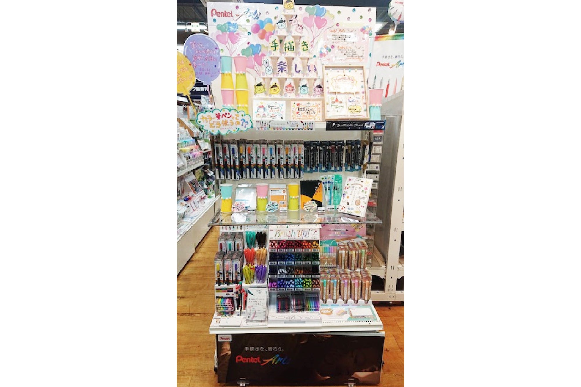 製品ごとの訴求はもちろん、陳列全体が「手描きを、贈ろう。」のコンセプトのもとPentel Artsとして、お客様に伝わりやすい展開になっていると感じました。持ち帰りできる試筆用紙のご用意や、広く設けていただいた試し書きスペースでは、お客様にPentel Artsを体感いただけたのではないかと思います。自作いただいた目を引くオリジナルキャラクターからは、スタッフの皆さまご自身が、Pentel Artsを楽しみながら売場づくりをしてくださったことが感じられました。