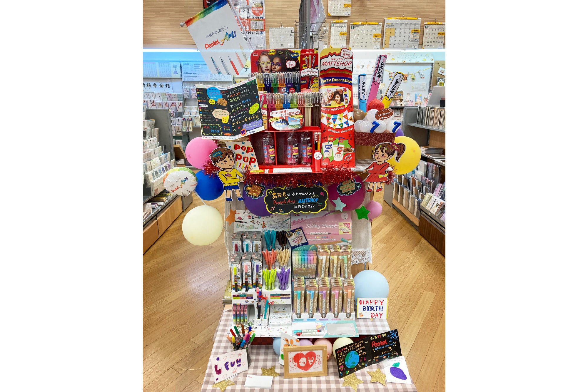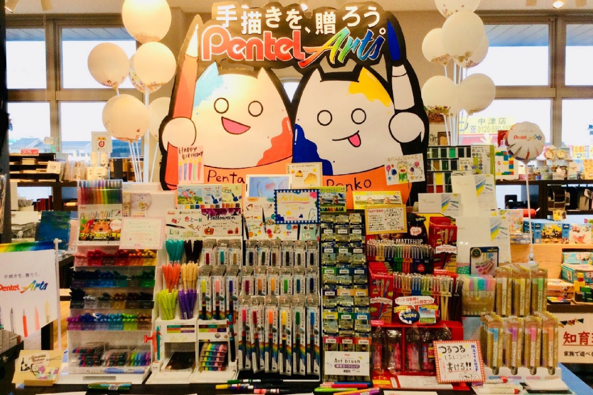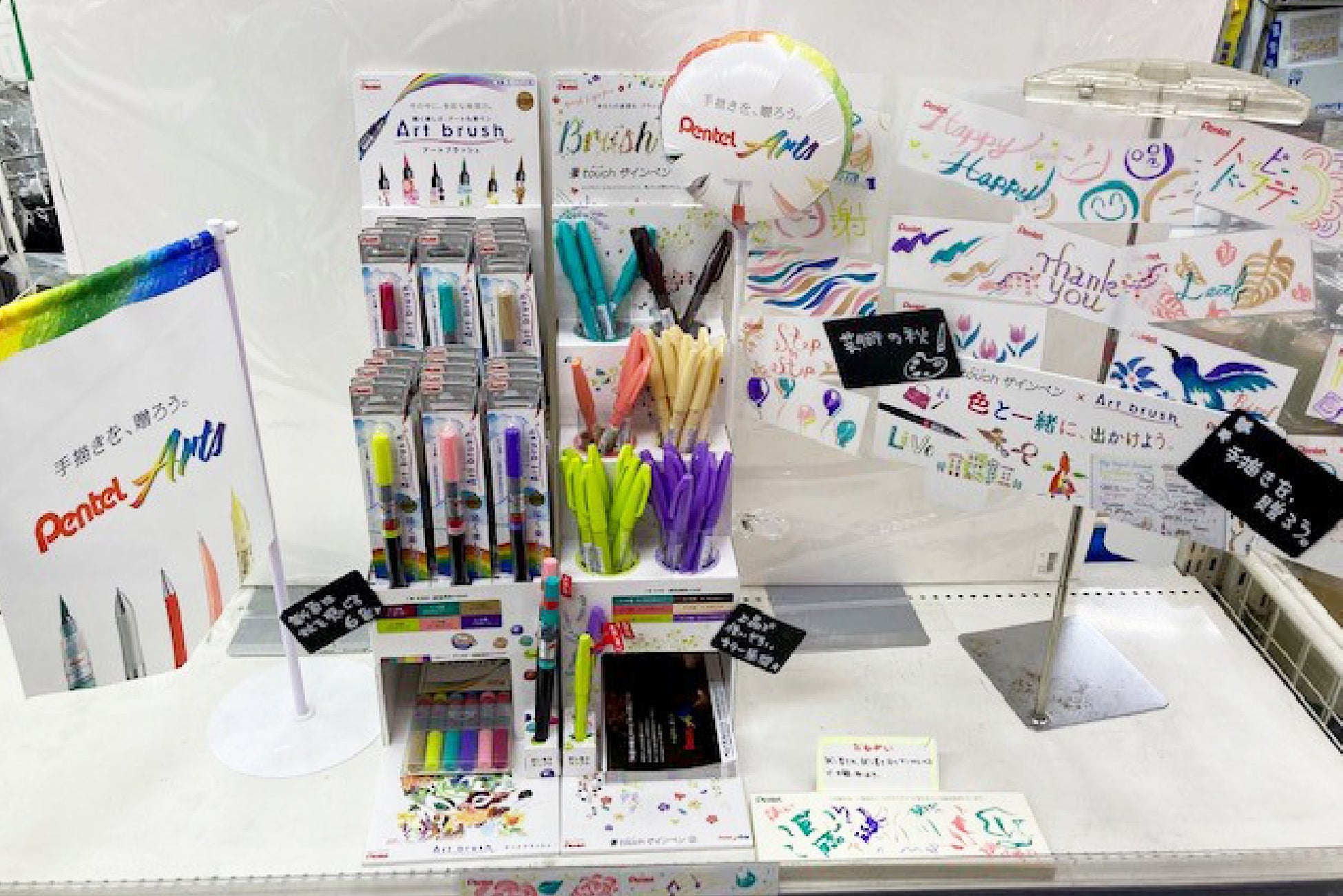 製品ごとの訴求はもちろん、陳列全体が「手描きを、贈ろう。」のコンセプトのもとPentel Artsとして、お客様に伝わりやすい展開になっていると感じました。持ち帰りできる試筆用紙のご用意や、広く設けていただいた試し書きスペースでは、お客様にPentel Artsを体感いただけたのではないかと思います。自作いただいた目を引くオリジナルキャラクターからは、スタッフの皆さまご自身が、Pentel Artsを楽しみながら売場づくりをしてくださったことが感じられました。