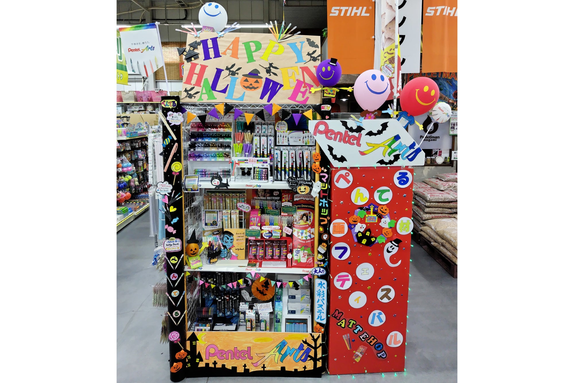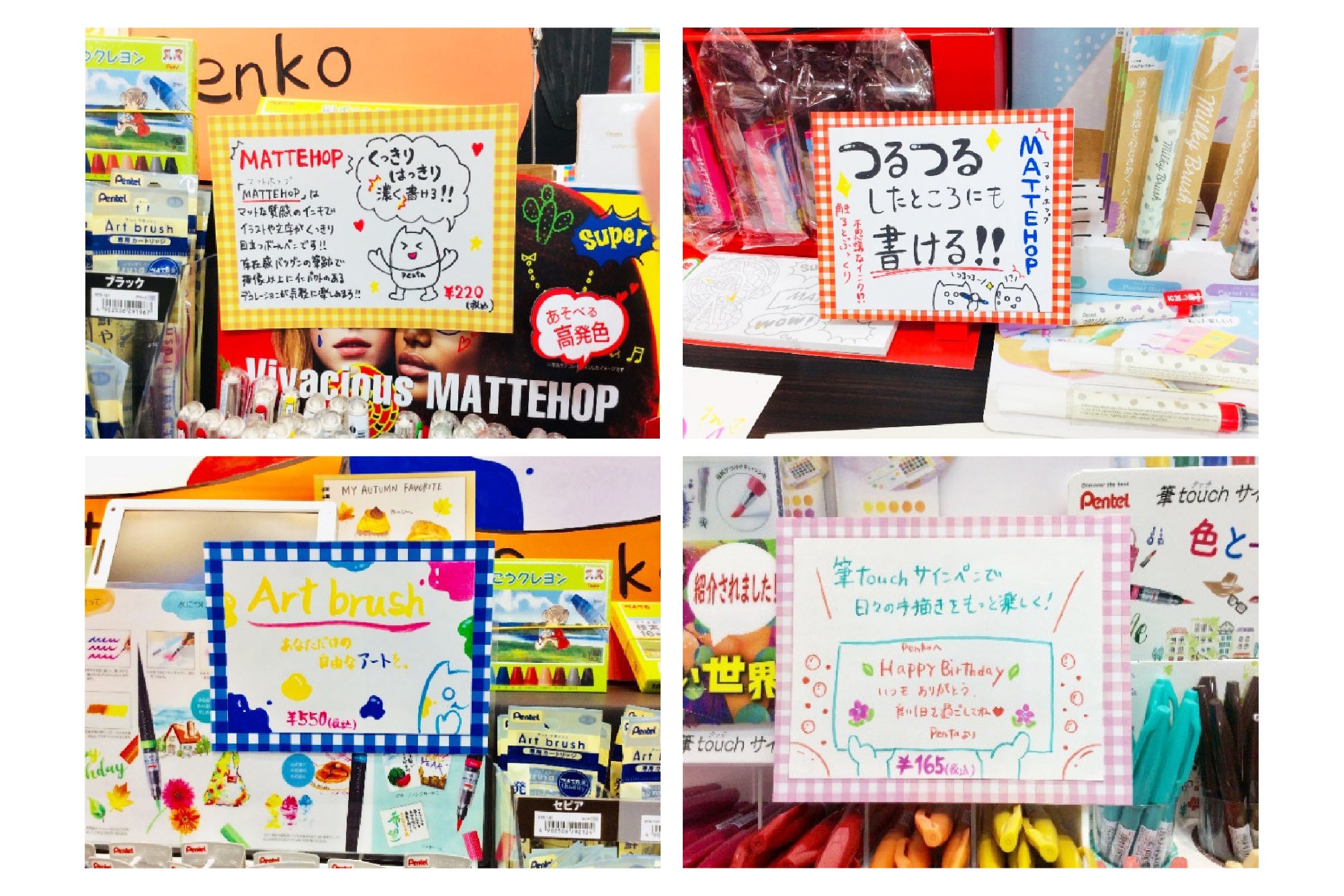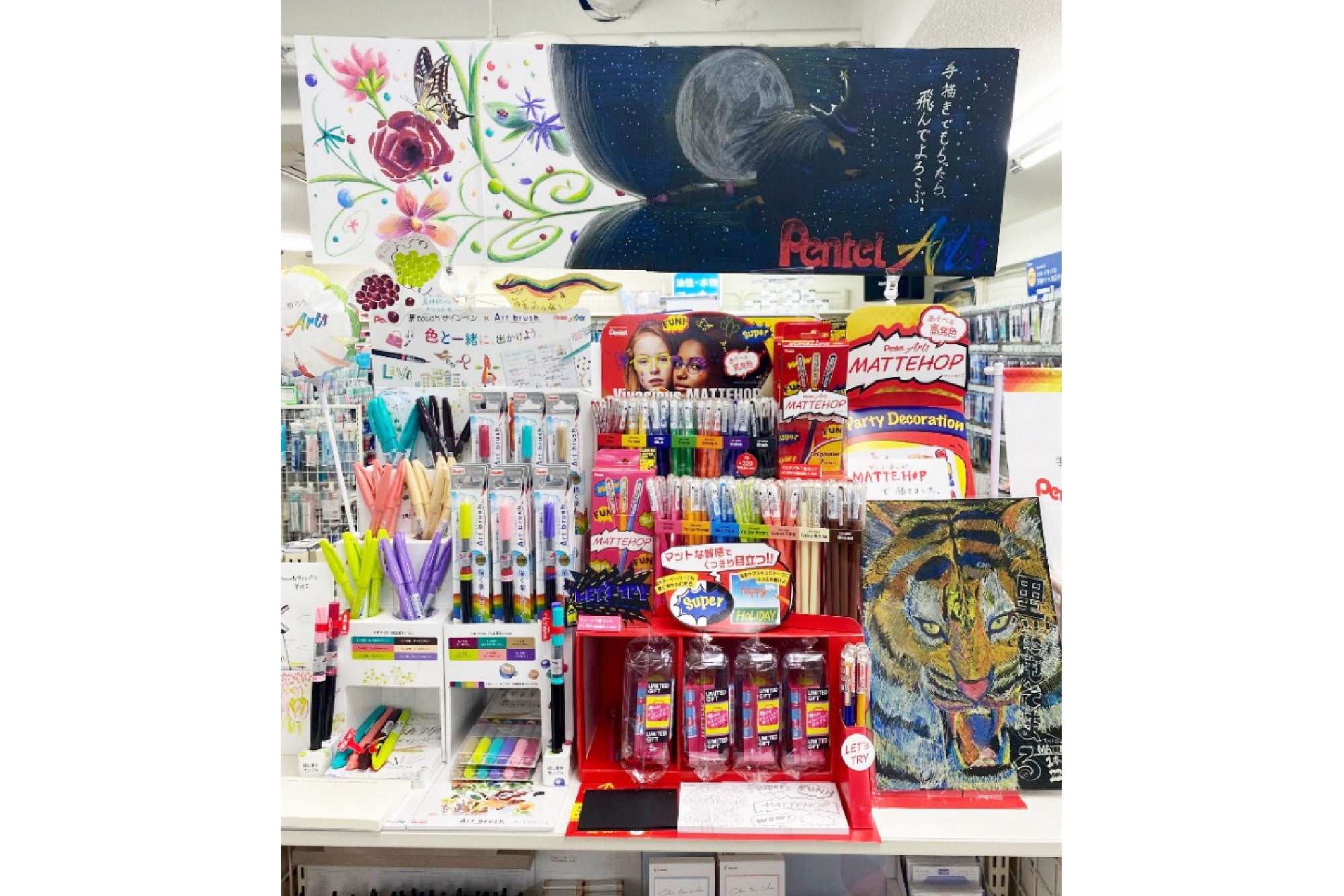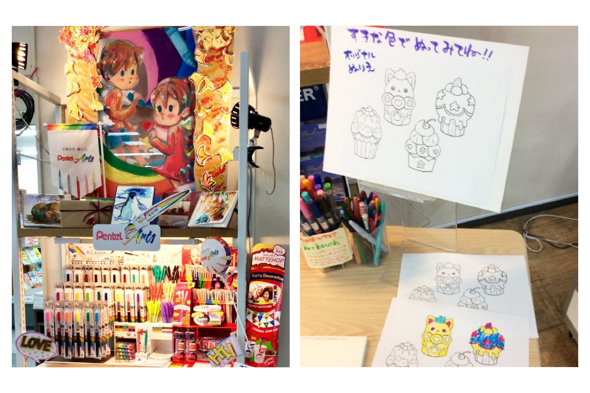 製品ごとの訴求はもちろん、陳列全体が「手描きを、贈ろう。」のコンセプトのもとPentel Artsとして、お客様に伝わりやすい展開になっていると感じました。持ち帰りできる試筆用紙のご用意や、広く設けていただいた試し書きスペースでは、お客様にPentel Artsを体感いただけたのではないかと思います。自作いただいた目を引くオリジナルキャラクターからは、スタッフの皆さまご自身が、Pentel Artsを楽しみながら売場づくりをしてくださったことが感じられました。