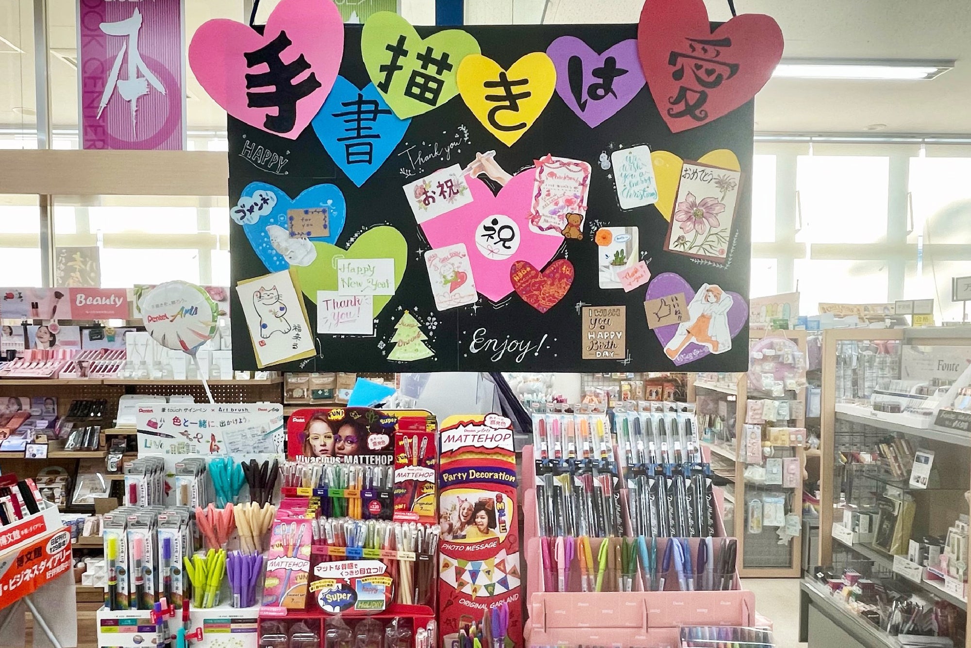 「手描きは愛」というトップボードがインパクト大です。この言葉は、実際にマットホップの開発インタビュー時に協力していただいた女子高生も話しており、彼女たちが楽しむデコ文化や推し活にも通じる言葉です。お客様も気分が上がる売場になっていると感じました。