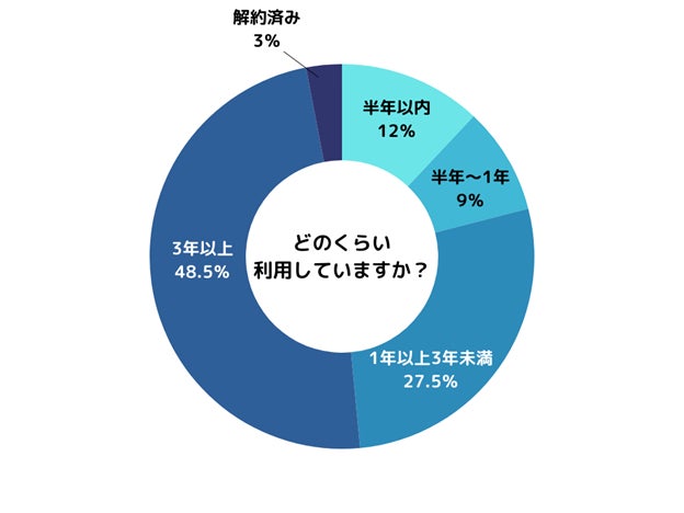 動画配信サービスを利用している人のおよそ半数に相当する48.5%の人が、3年以上継続利用しています。すでに動画配信サービスを解約している人は3%という結果になりました。