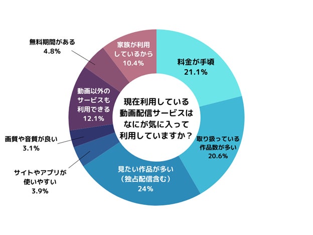 利用者のおよそ半数で、見たい作品が多い(24%)ことや、取り扱い作品数の多さ(20.6%)を気に入っているという回答があります。