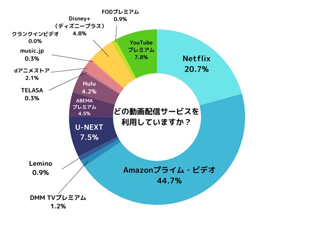 最も利用者の多い動画配信サービスは、Amazonプライム・ビデオで44.7%でした。続いてNetflixが20.7%、You Tubeプレミアムが7.8%でした。