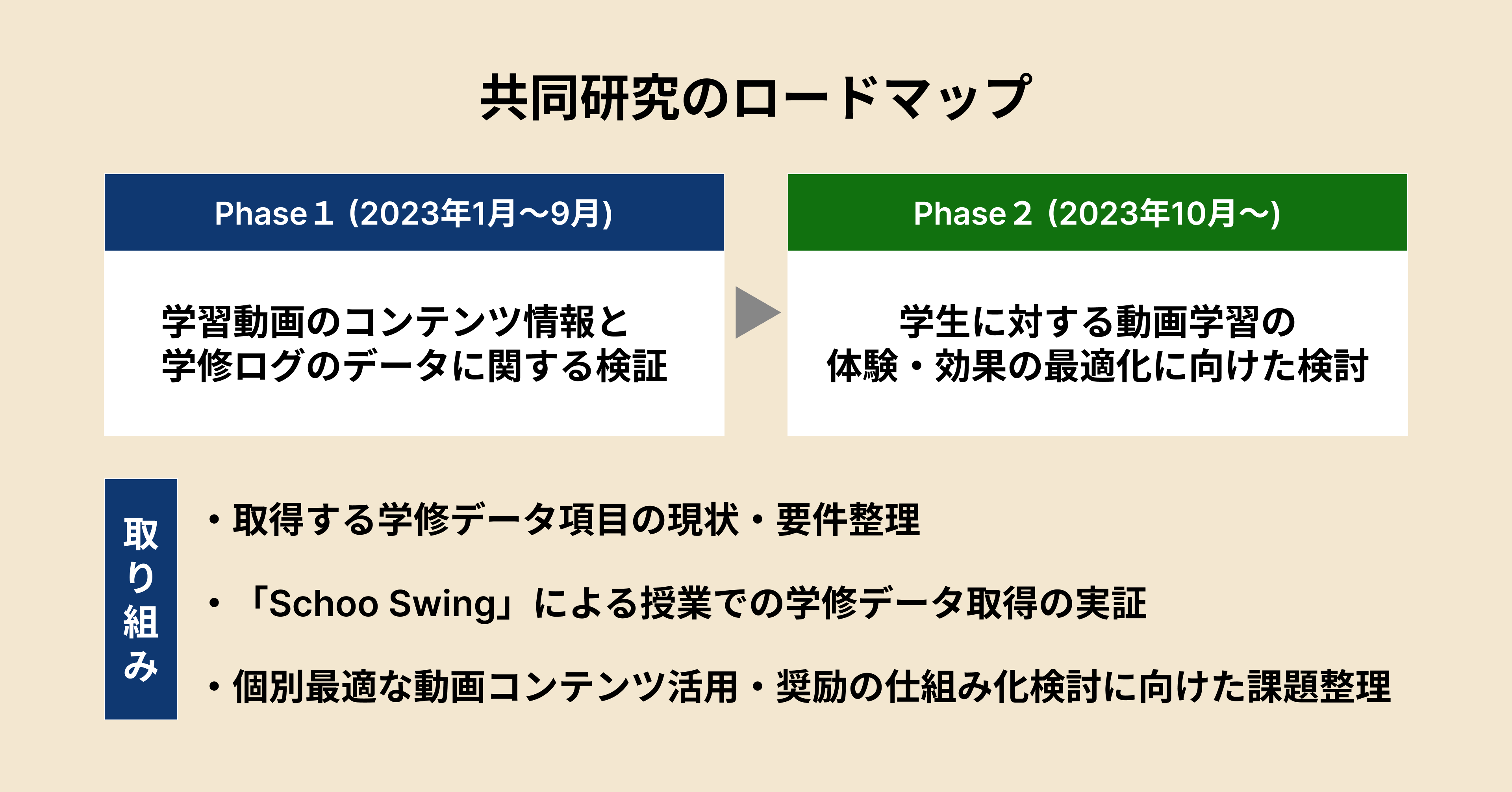 Phase1では学修動画のコンテンツ情報と学修ログのデータに関する検証のため、「Schoo Swing」を用いた学修ログの取得を行い、Phase2では取得したデータを元に学生に対する動画学修の体験・効果の最適化に向けた検討を行っていきます。