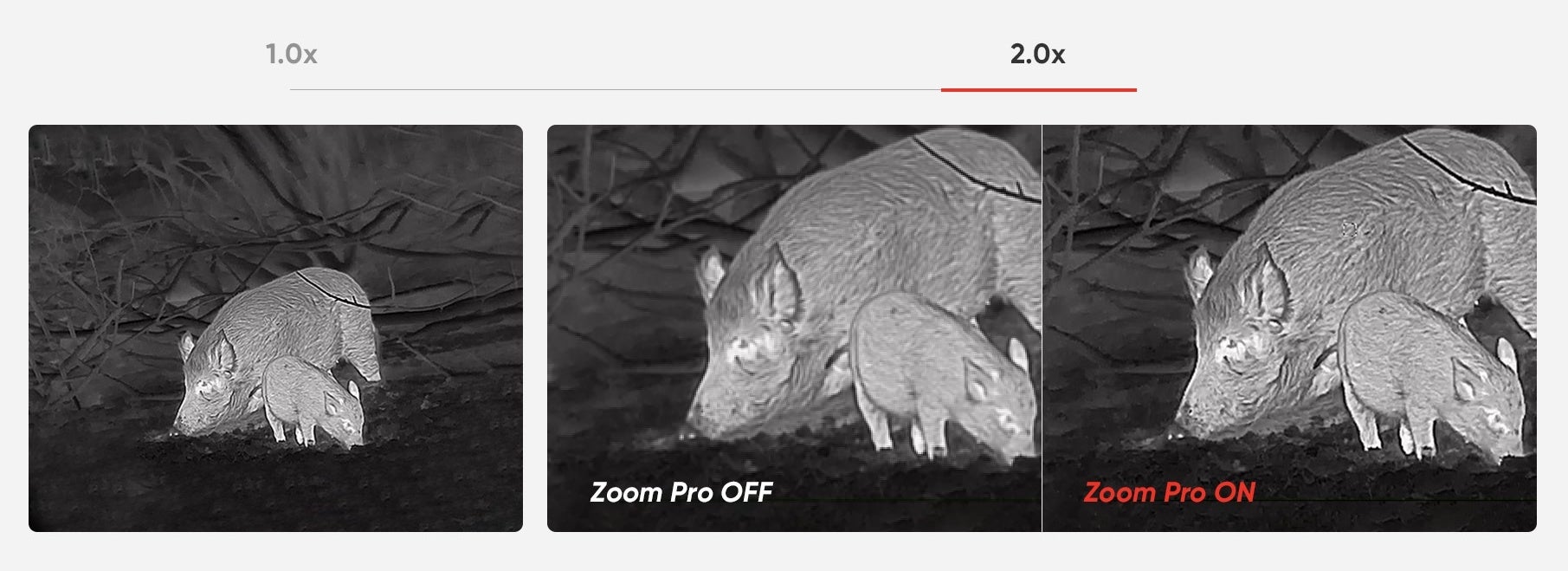 サーマルスコープが使用されるあらゆるシチュエーションを徹底的に分析することによって開発された新しい画像アルゴリズム「Zoom Pro」は、特にデジタルズームにおいて細部まで鮮明でなめらかな画像を提供します。