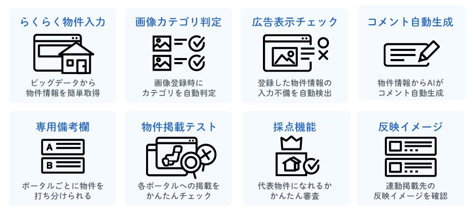 「いえらぶCLOUD」の物件連動機能は、ただ物件情報を出稿するだけではありません。物件入力の手間を軽減するだけでなく、より反響率の高い物件掲載を実現するための補助機能を多数搭載しています。