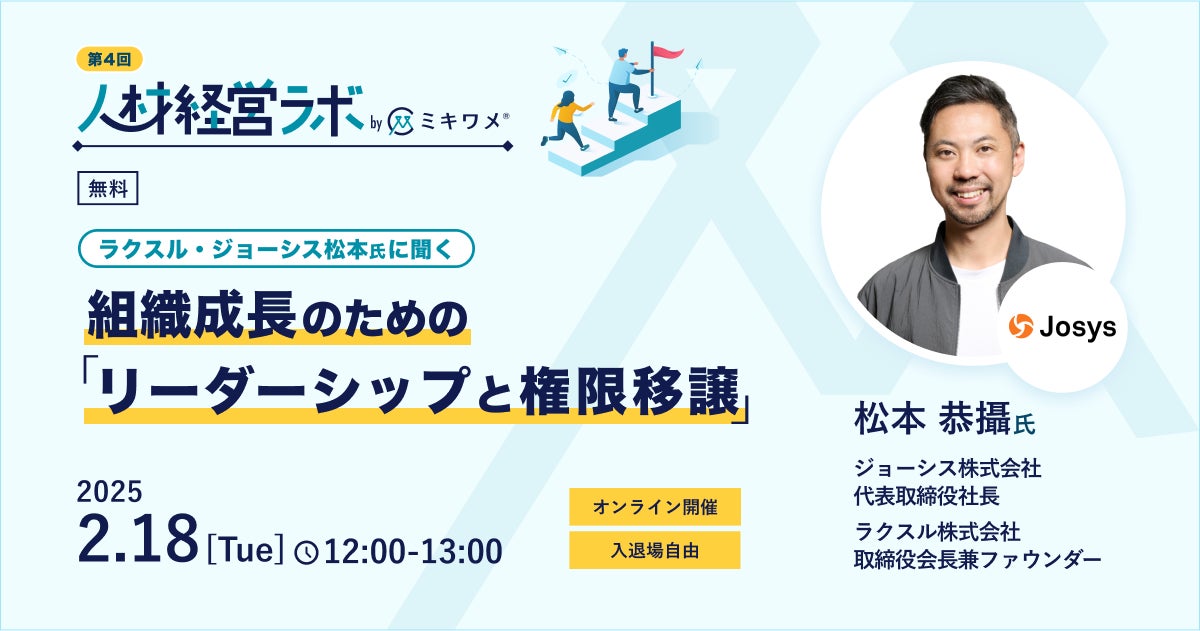 Personality Techを通じ「採用のミスマッチ」と「従業員の離職」を減らすHR事業「ミキワメ」を提供する株式会社リーディングマーク(本社:東京都港区、代表取締役社⻑:飯⽥ 悠司)は、2025年2月18日(火)12:00-13:00にて、オンラインイベント「人材経営ラボ」(ゲスト:ラクスル株式会社 取締役会長兼ファウンダー、ジョーシス株式会社 代表取締役CEO 松本 恭攝氏)を開催します。