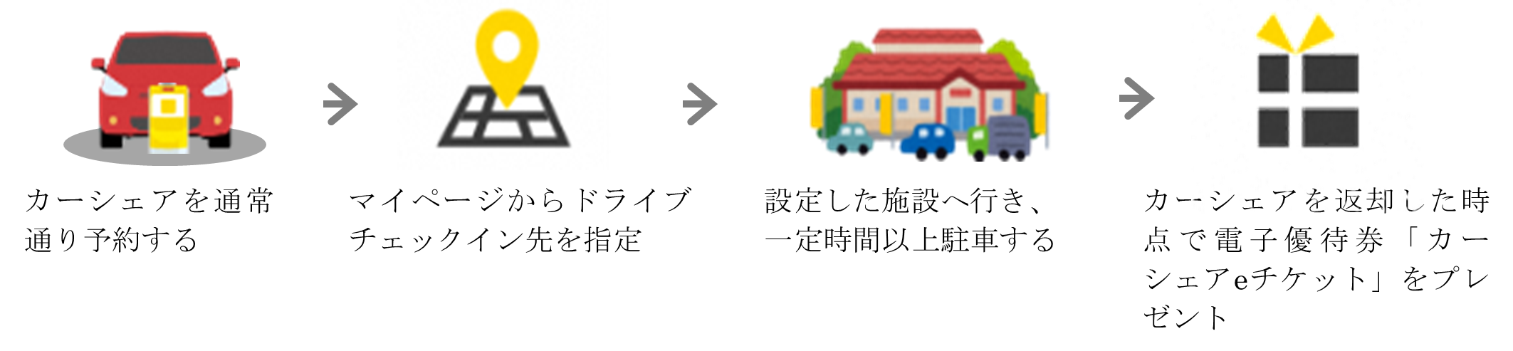 ※ドライブチェックイン:タイムズカー予約時、対象施設を行き先として設定し、現地でクルマを一定時間駐車すると次回以降に利用可能な電子優待券「カーシェアeチケット」が付与されるサービス