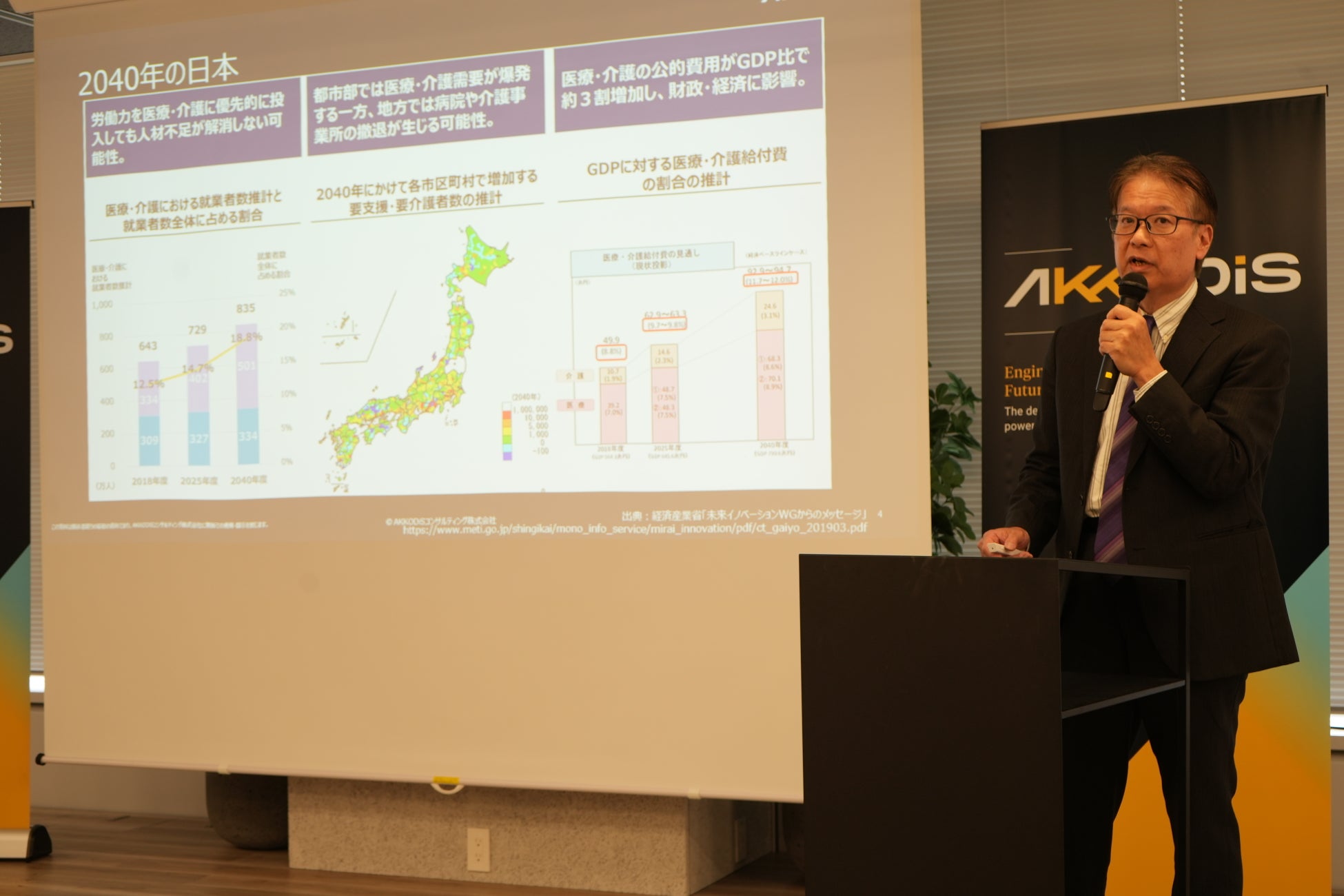 イベント冒頭で、AKKODiS People Development本部のマスターインストラクターで、JEITA(一般社団法人電子情報技術産業協会)の部品技術・実装技術ロードマップ各委員を務める谷本 琢磨博士より、将来の医療システムのイメージや医療DXの概要を説明、その後オムロンヘルスケア株式会社 鹿妻 洋之 氏、長野県伊那市役所 安江 輝氏、アイルランド ダブリンシティ大学 勝木 将人博士の3名の講演が行われました。