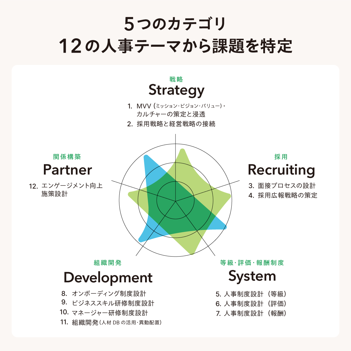 今回リリースしたスタートアップ人事制度診断 by INITIALは、スタートアップで活躍する様々な人事担当者の方へのヒアリングをもとに設計されており、課題になりうる共通テーマを型化しています。
