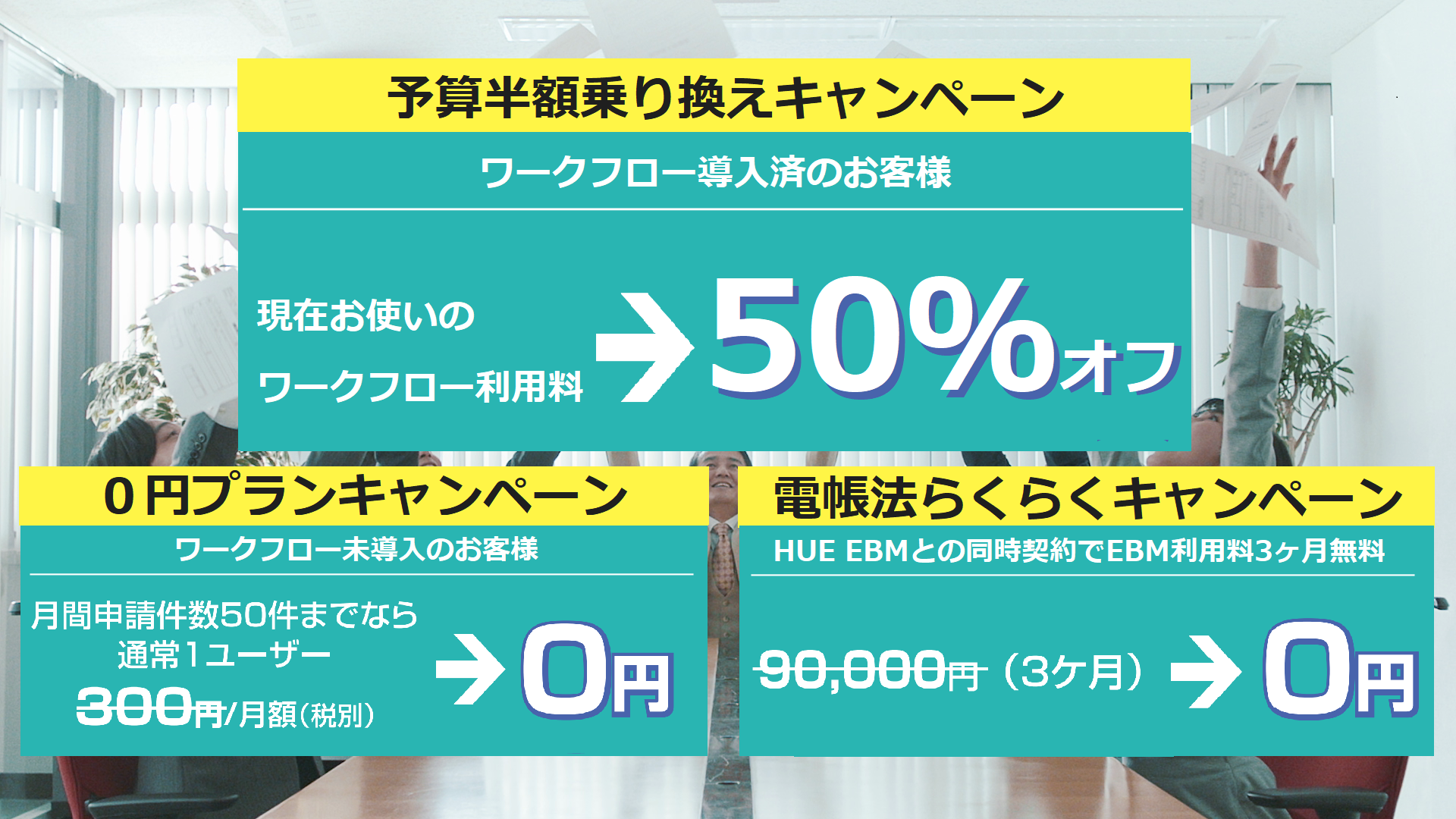| 内容 | 既にワークフローを電子化している企業向けに、現在利用中のサービス利用料金の50%の価格で提供。 | スモールスタートをしたい、紙からの置き換えをじっくり行いたい企業向けに、月間申請件数50件までの利用料金を0円(無料)で提供。日常の業務を通して「HUEワークフロー」のさまざまな機能を試すことが可能。 | HUE EBMを同時契約した場合に、EBMサービスを3ヶ月間無料で提供。 ※EBM:電子帳簿保存法に対応した証憑保存に特化したサービス。24年1月1日からスタートする電子取引情報保存の完全義務化に向けて、簡単にシステムでの対応が可能。 |