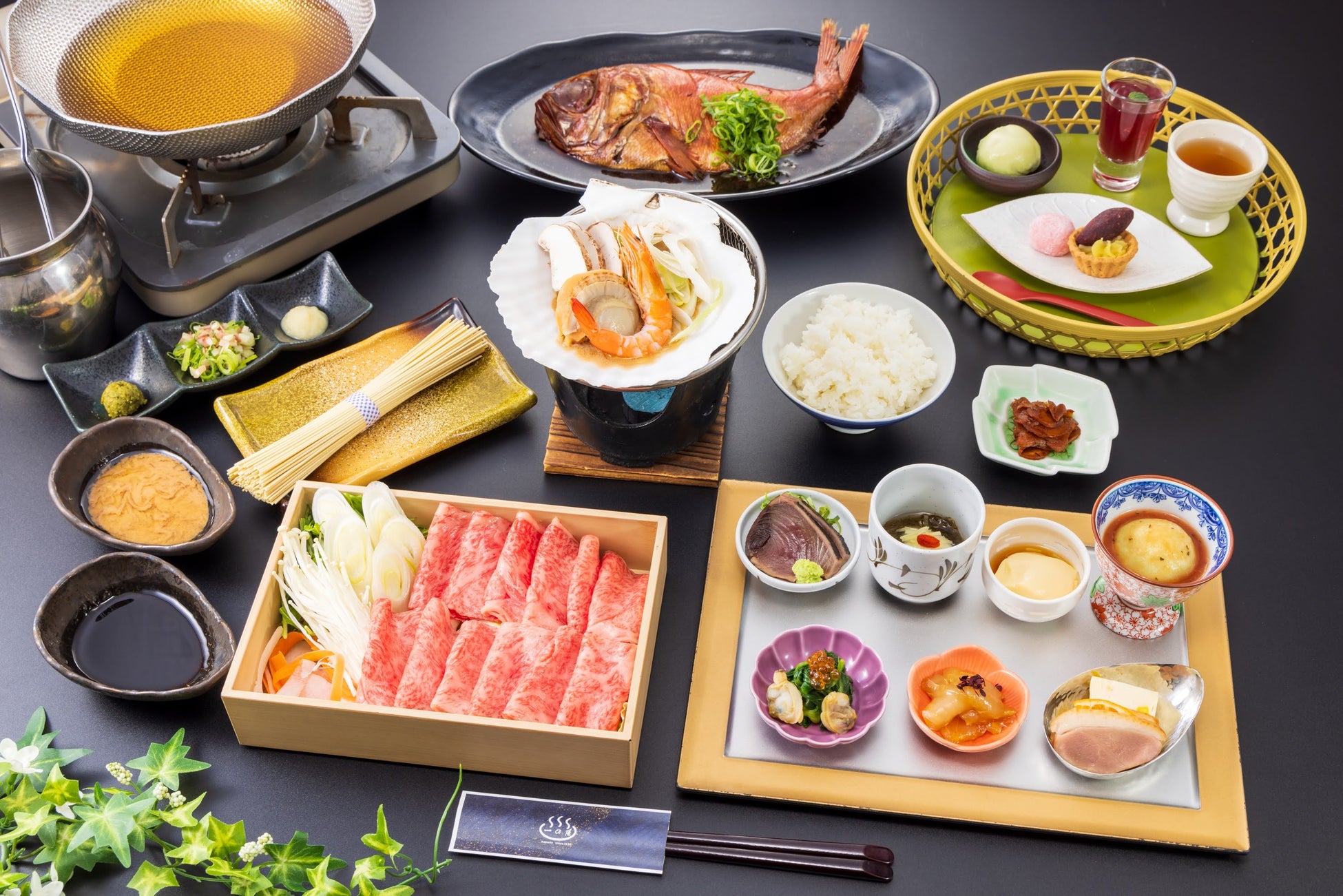 お食事は、陽だまり一の湯ではこだわりの創作和食でお料理を満喫できるプランでご用意しております。定番の金目鯛の煮付けや、米沢牛のしゃぶしゃぶなど季節のものや一の湯伝統のお食事をこだわって提供しております。ぜひご賞味ください。