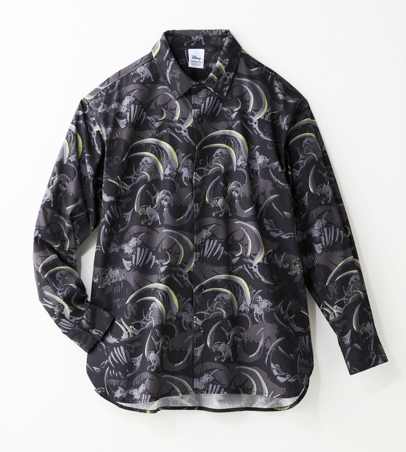 象の墓場のシーンを描いたクールな総柄シャツです。「スカー」とハイエナが一緒にデザインされていて、映画のワンシーンを彷彿させます。やや長めの丈が特徴で、羽織りとしても、ショートパンツに合わせたトレンドの着こなしにも最適です。