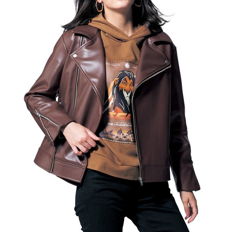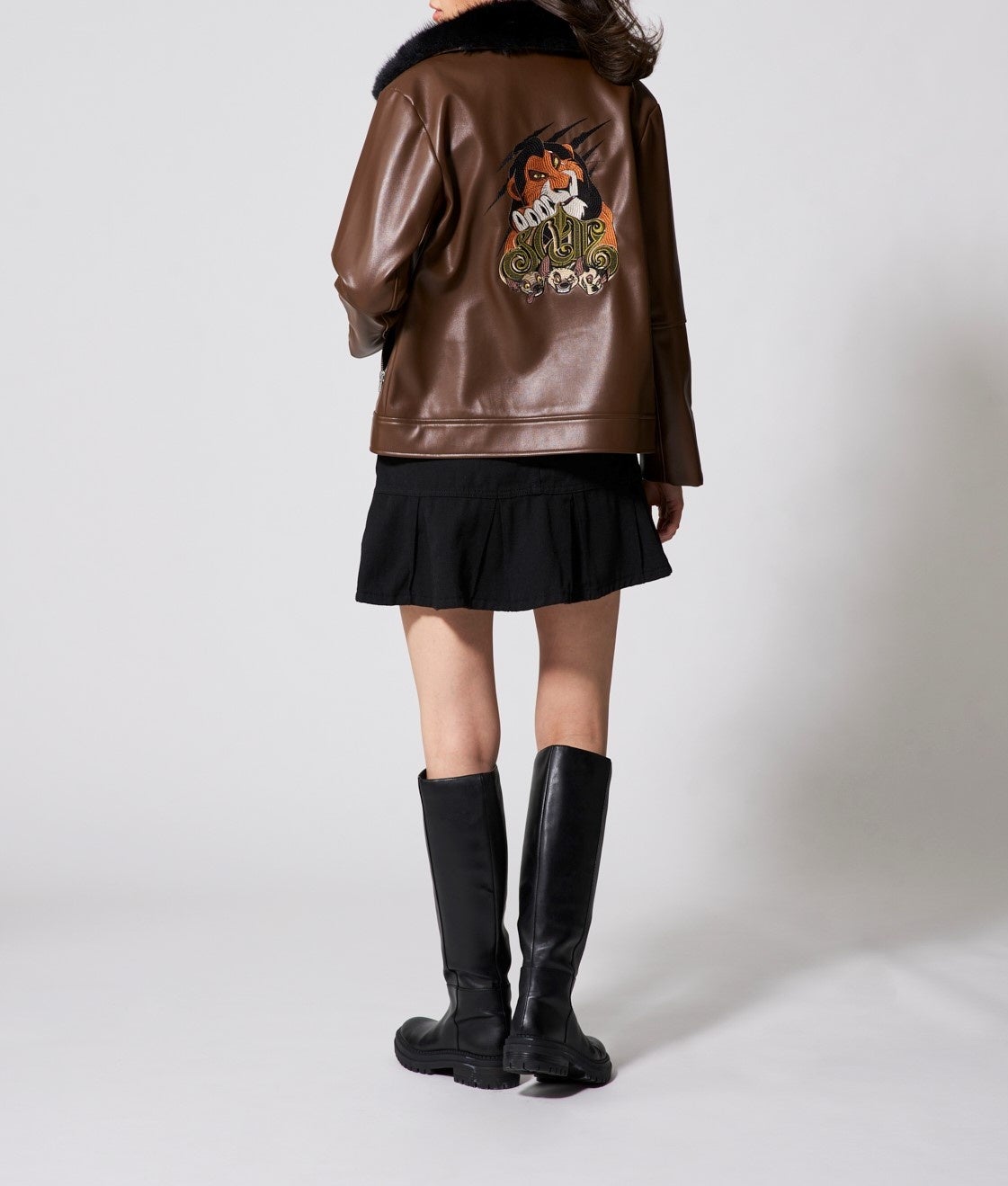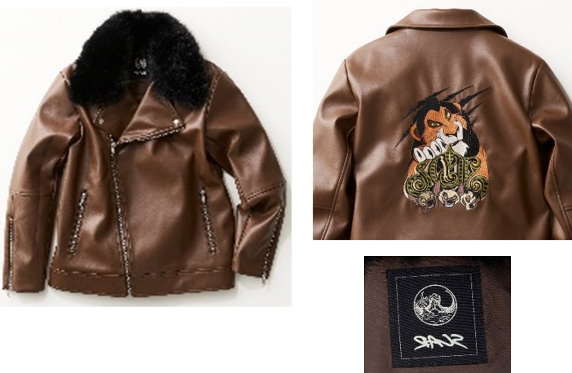 「スカー」のたてがみをイメージしたフェイクファーと背中の大胆な刺繍がポイントのライダースジャケットです。刺繍には子分のハイエナたちも登場します。フェイクファーは取り外し可能で、男女ともに着られるサイズ展開です。
