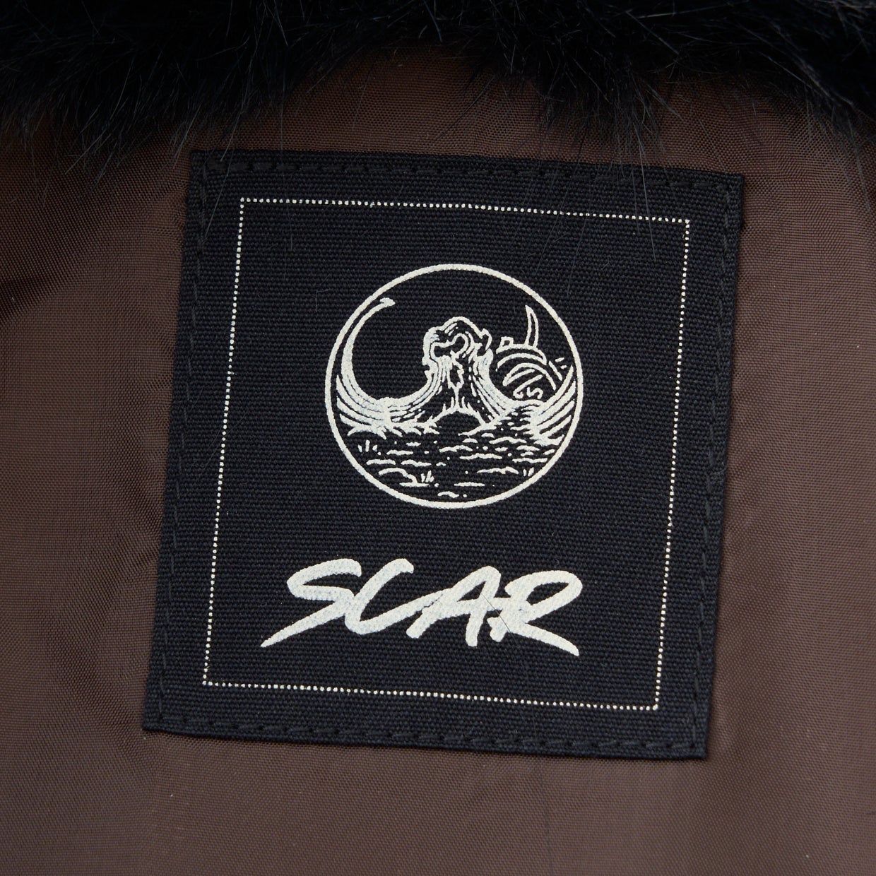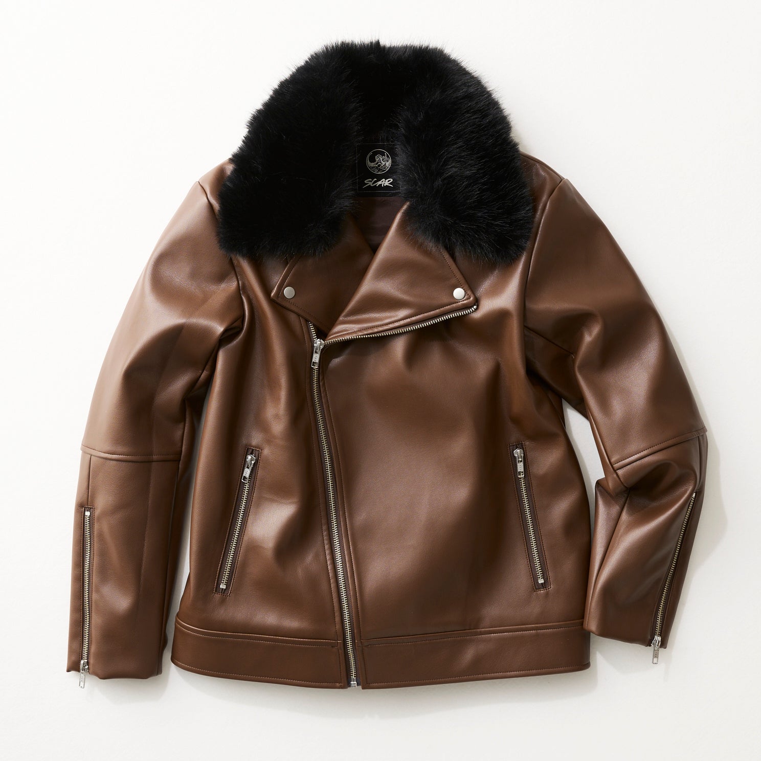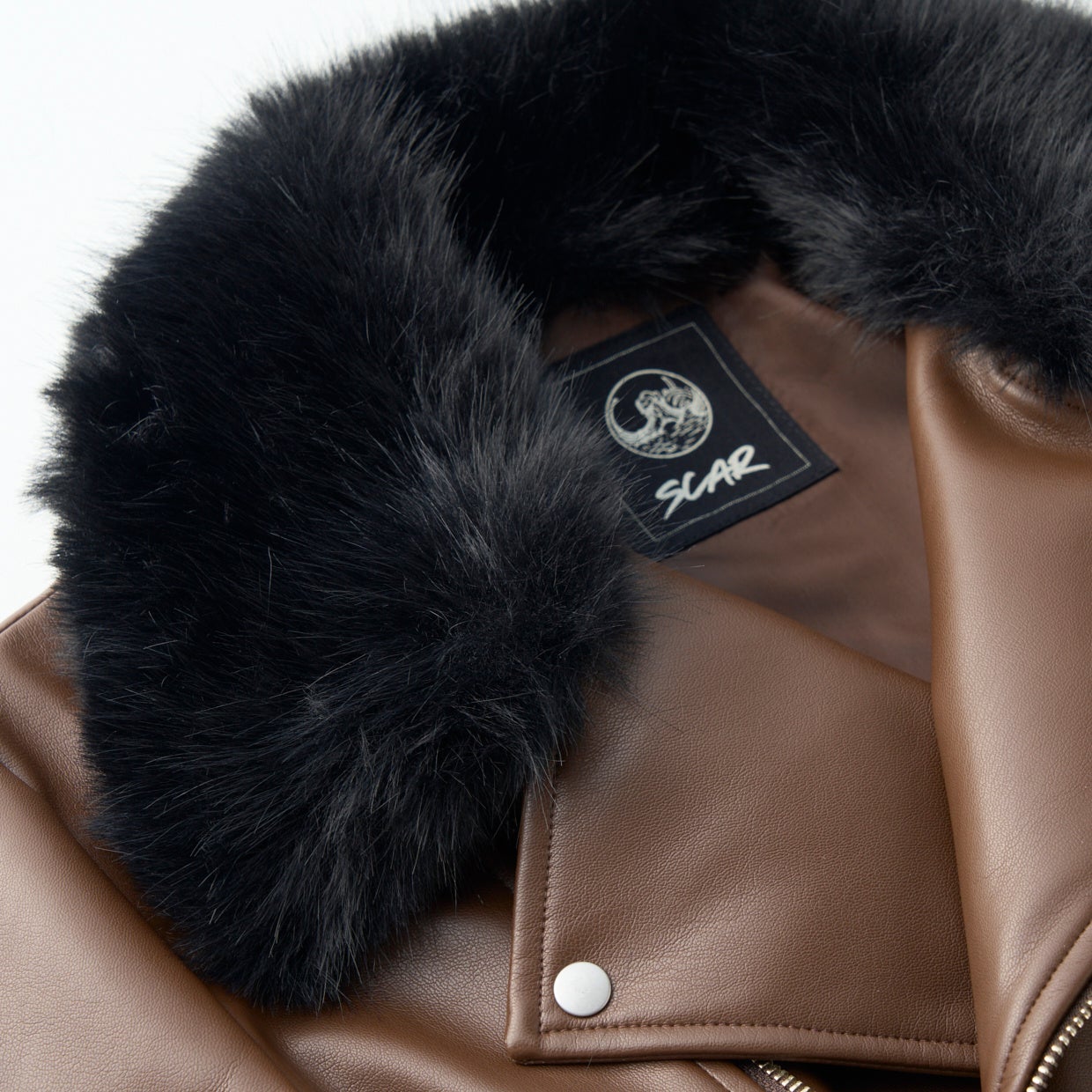 「スカー」のたてがみをイメージしたフェイクファーと背中の大胆な刺繍がポイントのライダースジャケットです。刺繍には子分のハイエナたちも登場します。フェイクファーは取り外し可能で、男女ともに着られるサイズ展開です。