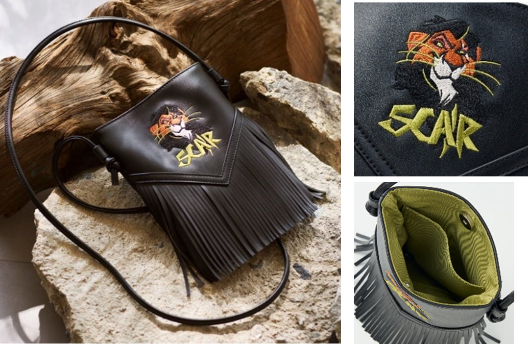 色鮮やかな刺繍とたてがみをイメージしたフリンジがアクセントのショルダーバッグです。スマートフォンやハンカチを入れやすく、ちょっとしたお出かけにぴったりなサイズ感です。「スカー」の目の色をイメージしたグリーンの内生地が特徴です。