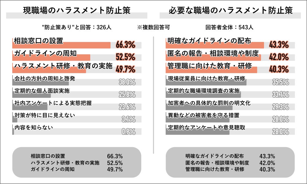 防止策ありと回答した326人に対策内容を聞くと、「相談窓口の設置」が66.3%で最多となり、次いで「ガイドラインの周知」が52.5%、「ハラスメント研修・教育の実施」が49.7%となりました。回答者全体の543人に、職場のハラスメント防止に必要な対策を聞くと、「明確なガイドラインの配布」が43.3%で最多となり、次いで「匿名の報告・相談環境や制度」が42.0%、「管理職に向けた教育・研修」が40.3%となりました。