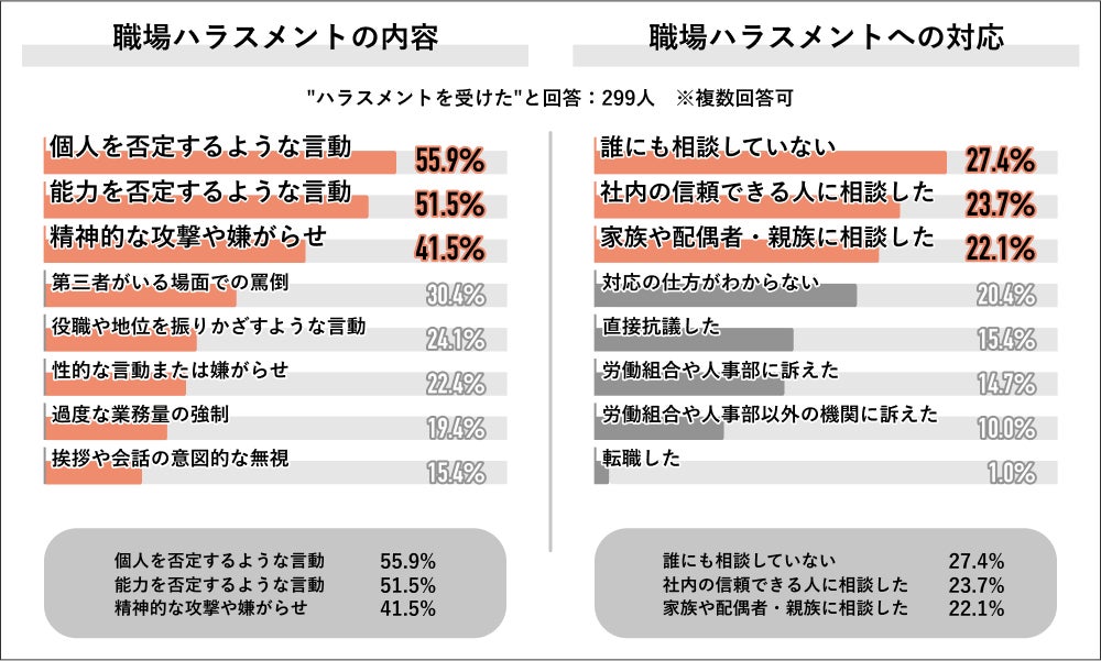 被害経験ありと回答した299人に受けたハラスメントの内容を聞くと、「個人を否定するような言動」が55.9%で最多となり、次いで「能力を否定するような言動」が51.5%、「精神的な攻撃や嫌がらせ」が41.5%となりました。また、職場ハラスメントへの対応を聞くと、「誰にも相談していない」が27.4%で最多となり、次いで「社内の信頼できる人に相談した」が23.7%、「家族や配偶者・親族に相談した」が22.1%となりました。