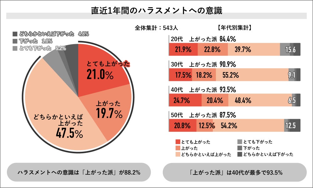 回答者全体の543人に直近1年間のハラスメントへの意識を聞くと、「上がった派」が88.2%で大多数を占め、内訳は「とても上がった」が21.0%、「上がった」が19.7%、「どちらかといえば上がった」が47.5%となりました。「上がった派」の年代別では40代が93.5%で最多となり、次いで30代が90.9%、50代が87.5%、20代が84.4%となりました。