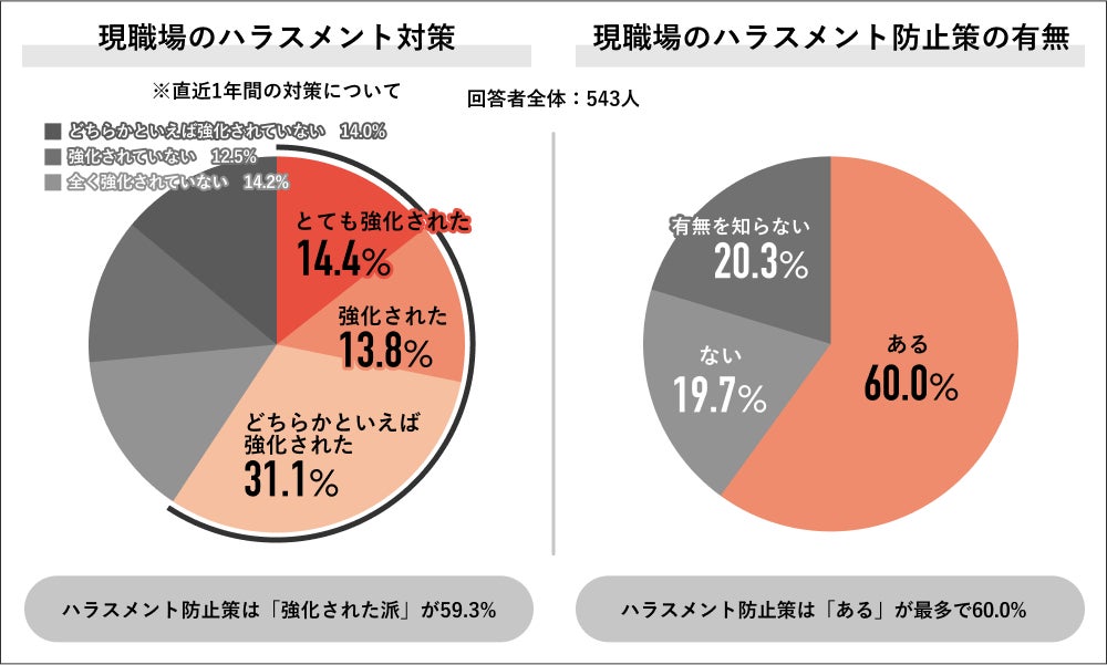 回答者全体の543人に直近1年間の現職場のハラスメント対策を聞くと、「強化された」が59.3%で過半数を占め、内訳は「とても強化された」が14.4%、「強化された」が13.8%、「どちらかといえば強化された」が31.1%となりました。現職場のハラスメント防止策の有無を聞くと、「ある」が60.0%で過半数を占め、内訳は「ない」が19.7%、「有無を知らない」が20.3%となりました。