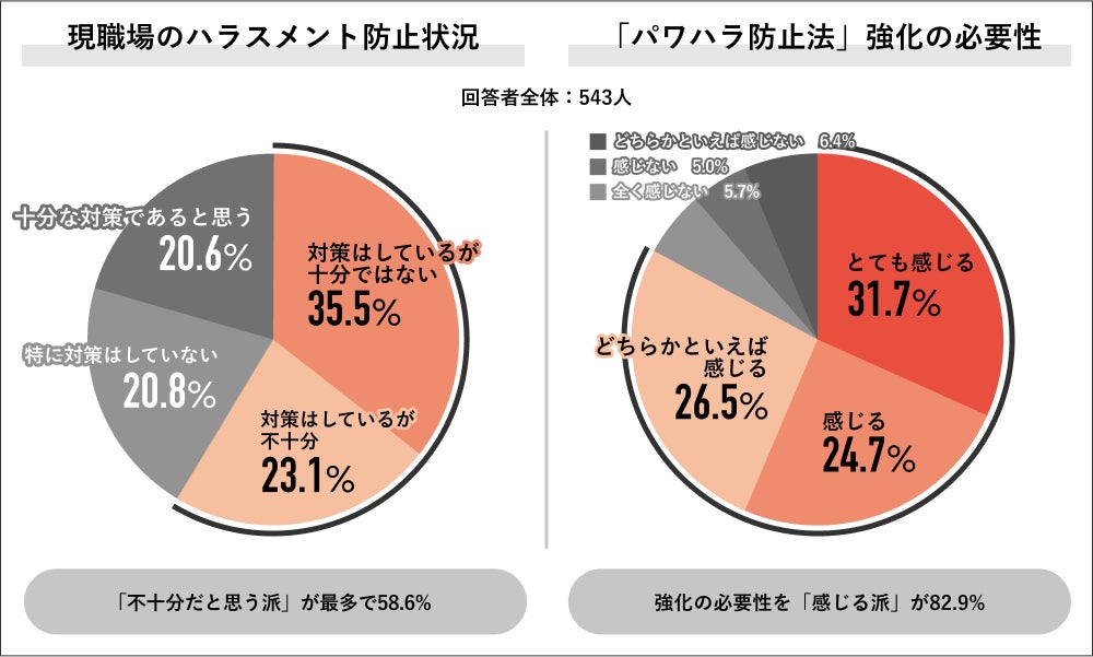 回答者全体の543人に現職場のハラスメント防止対策への印象を聞くと、「不十分だと思う派」が58.6%で最多となり、内訳は「対策はしているが十分ではない」が35.5%、「対策はしているが不十分」が23.1%となりました。また、「パワハラ防止法」強化の必要性を感じるかを聞くと、「必要性を感じる派」が82.9%で過半数を占め、内訳は「とても感じる」が31.7%、「感じる」が24.7%、「どちらかといえば感じる」が26.5%となりました。