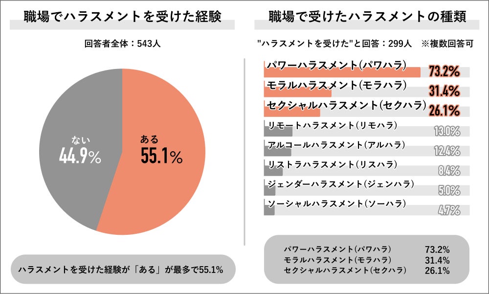 回答者全体の543人に職場でハラスメントを受けた経験を聞くと、「ある」が55.1%で過半数を占め、内訳は「ない」が44.9%となりました。被害経験ありと回答した299人に受けたハラスメントの種類を聞くと、「パワーハラスメント(パワハラ)」が73.2%で最多となり、次いで「モラルハラスメント(モラハラ)」が31.4%、「セクシュアルハラスメント(セクハラ)」が26.1%となりました。
