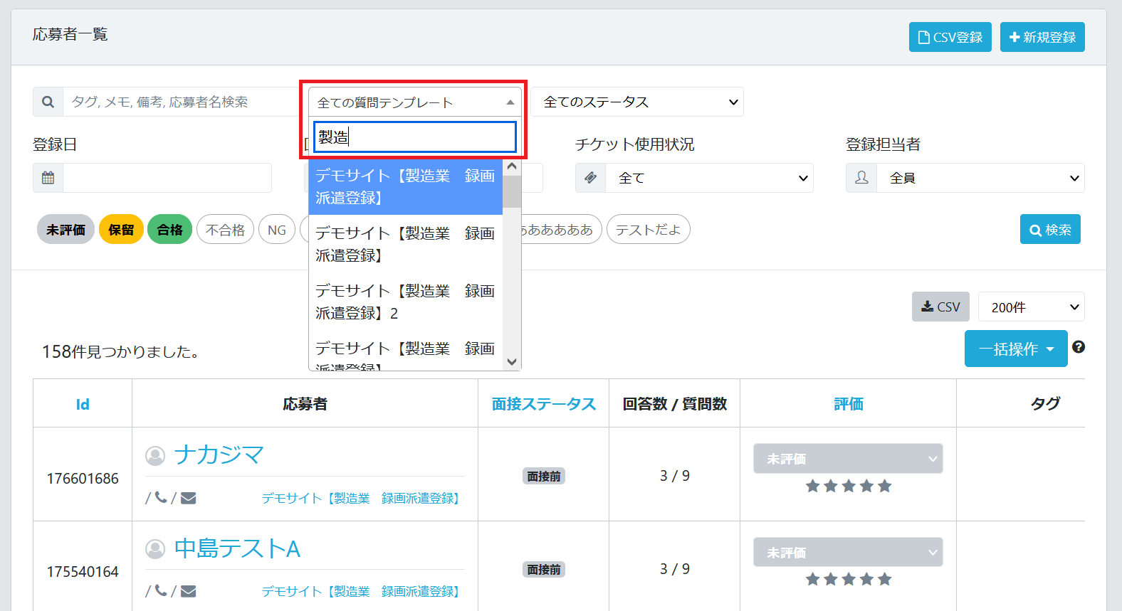 派遣応募者の取りこぼしを防ぐ!録画面接ツールITSUMEN(イツメン)、質問テンプレート検索(応募者検索条件)にテンプレート検索BOXを追加