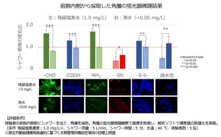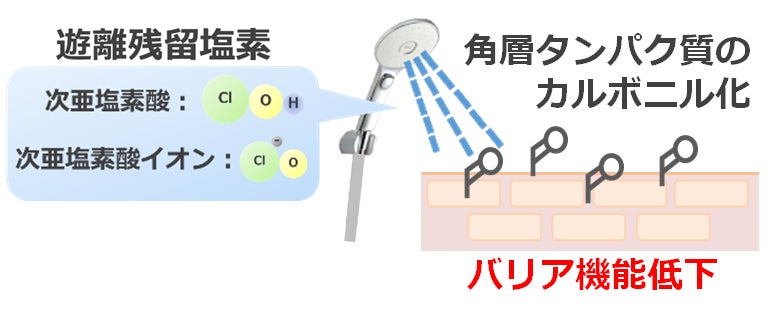 その結果、残留塩素による種々の官能基の増減による角層タンパク質の変性や、それによる疎水性の低下が確認されました。このことから、水道水中の残留塩素によるバリア機能低下は、カルボニル化以外のタンパク質変性の要因にもなっていると考えられました。そのため、水道水の使用により、肌は日常的にタンパク質の変性リスクに晒されており、残留塩素を除去した浄水の使用は、皮膚の健康維持の観点から重要な意味があると示唆されました。