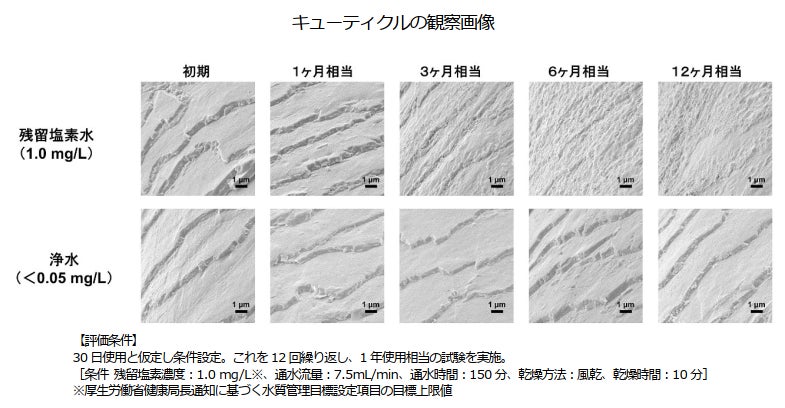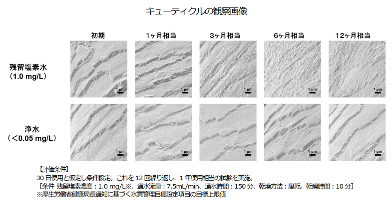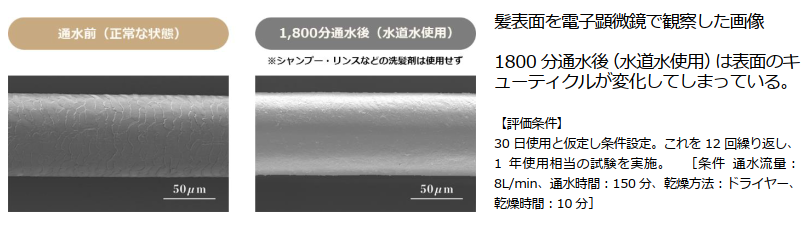 LIXILではこれまでに、水道水の残留塩素によってキューティクルが損傷することを報告してきましたが、その経時的な損傷過程は不明でした。