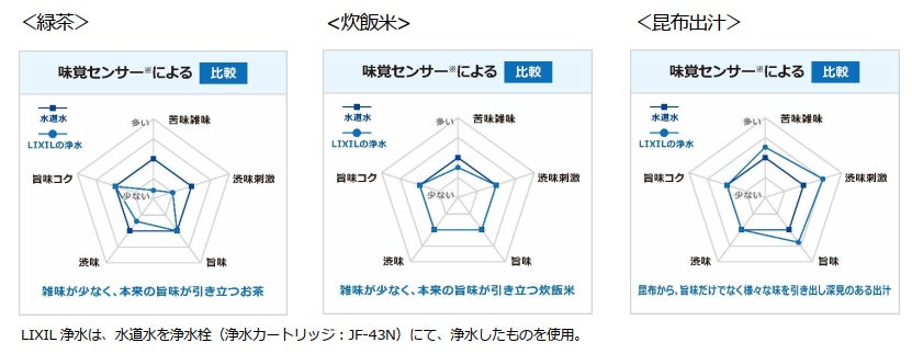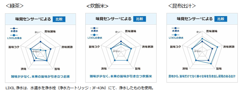 料・調理品に浄水を使うことで、味の変化が味覚センサーの評価で示されています。