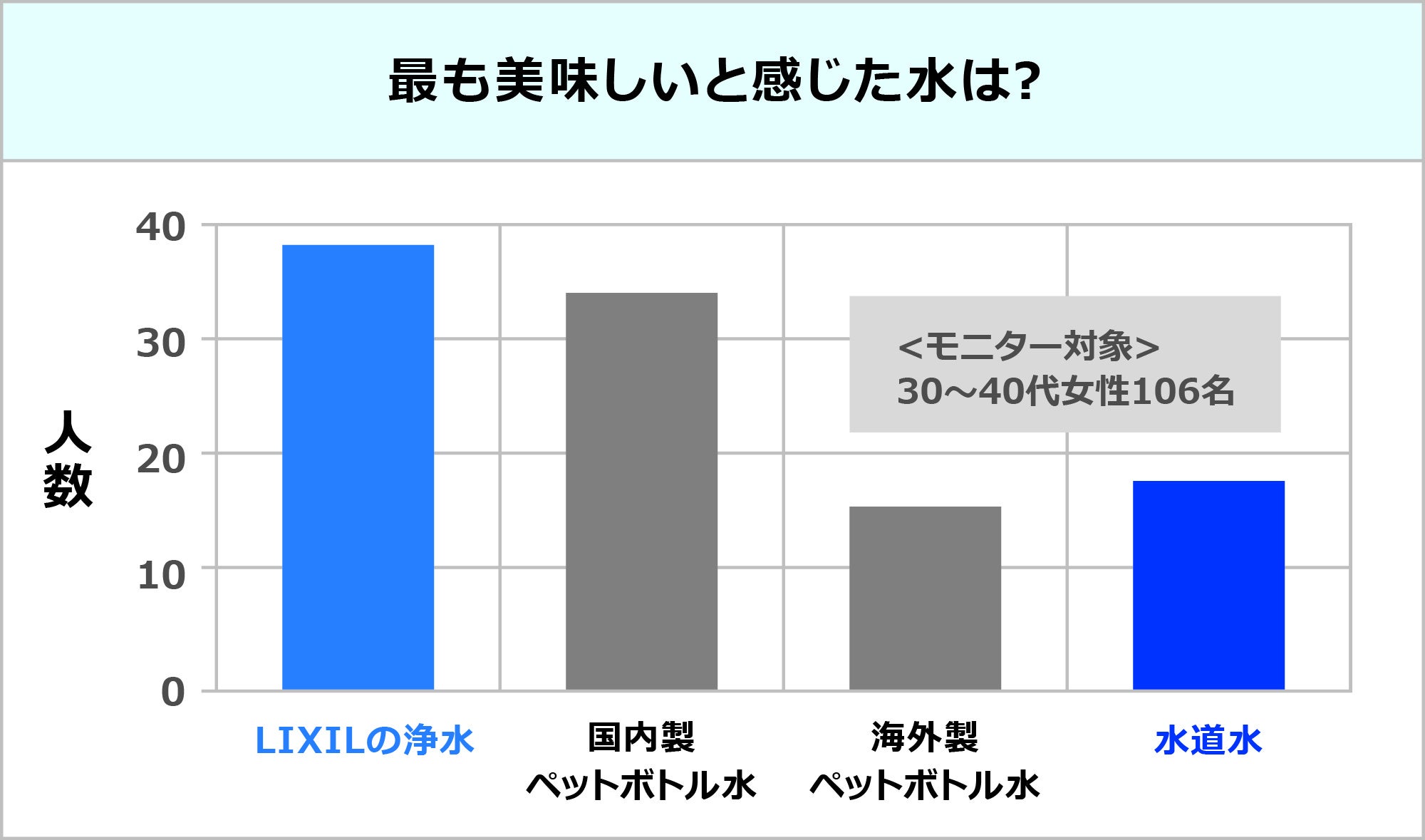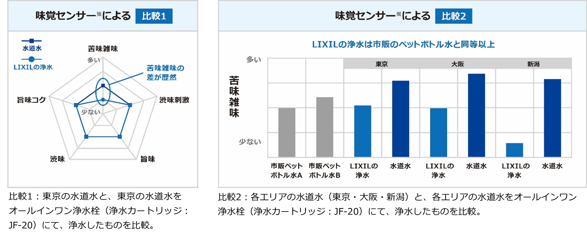 味覚センサー(https://www.insent.co.jp/product/)を用いて様々な水の味を研究した結果、LIXILでは「水がおいしい」と感じるためには「苦味雑味」を取り除くことが効果的であると考えました。さらに研究を重ねた結果、LIXIL浄水は市販のペットボトル水と同等の低い雑味であることが判明しています。