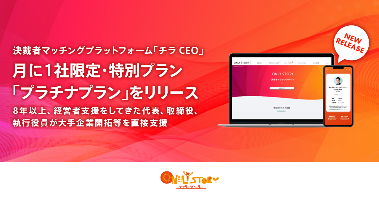決裁者マッチングプラットフォーム「チラCEO」を運営する株式会社オンリーストーリー(代表取締役:平野哲也、本社:東京都渋谷区)は、月1社限定を対象とした「プラチナプラン」をリリースいたします。経営者支援を行ってきた代表・取締役・執行役員が直接ジョインし、事業成長のために必要な大手・成長企業マッチング等の直接支援を含む営業支援を行います。