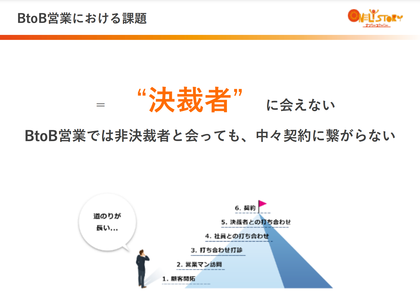 株式会社オンリーストーリーは8年以上の間独自のネットワーク基盤を構築し続け、「決裁者に会えない」と悩む方々に対して決裁者商談の獲得支援を行い、双方の経営・営業課題解決に取り組みました。その過程で得た決裁者商談のコツやノウハウをもとに、決裁者マッチングプラットフォーム「チラCEO」を運営し、主にはBtoB企業の決裁者商談機会の創出に取り組むことで経営・営業課題の解決に貢献しています。