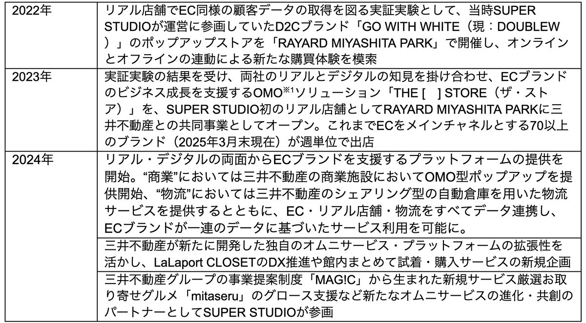 これまでSUPER STUDIOと三井不動産は、リアルとデジタルを融合したコマース領域において、事業者の成長支援に向けた取り組みを継続してまいりました。