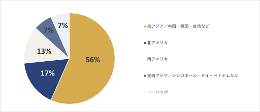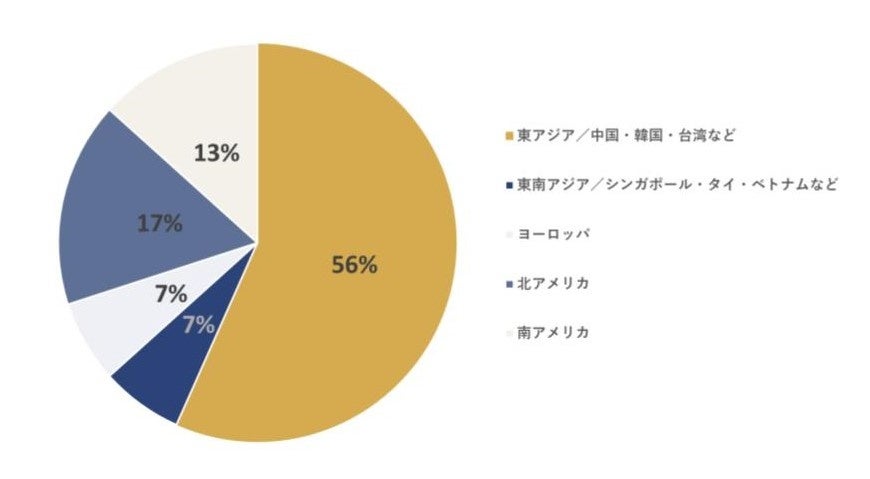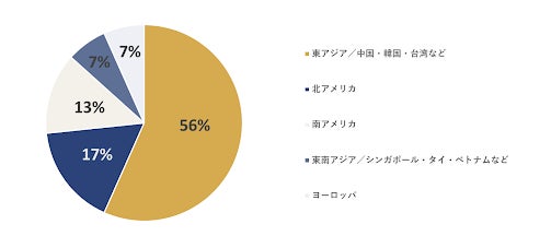 東アジア(中国・韓国・台湾など)56%、東南アジア(シンガポール・タイ・ベトナムなど)17%、北アメリカ13%という結果となった。