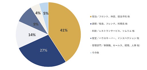 宿泊(フロント・仲居・宿泊予約)41%、調理27%、料飲14%と続いた。