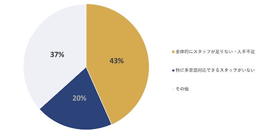 「全体的にスタッフが足りない(人手不足)」という回答が43%となった。次いで、「特に言語対応できるスタッフがいない」という回答となった。その他意見として、「中国語ができるスタッフがいない」、「若手スタッフが不足気味」という声もあがった。