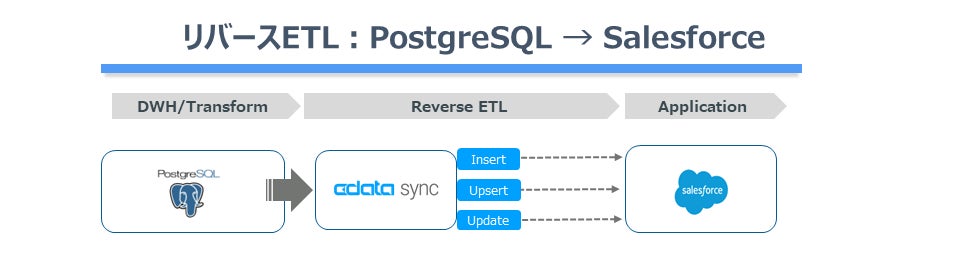 CData Sync は、データベースやSaaS から収集したデータをSalesforce に書き戻すリバースETL 機能を備えています。Snowflake、SQL Server に加え、今回のリリースでは、PostgreSQL およびAmazon Aurora PostgreSQL からもSalesforce へのリバースETL が可能になりました。PostgreSQL に収集され集計・スコアリングなどをされたデータをSalesforce に書き戻して利用することで、業務ユーザーは豊富で多面的な顧客データを元にデータドリブンな顧客業務を行うことができるようになります。